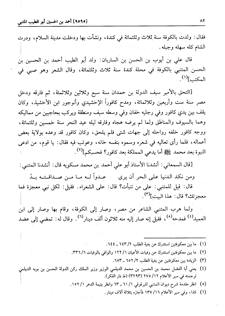 قال علي بن أيوب بن الحسن بن الساربان: ولد أبو الطيب أحمد بن الحسين بن الحسن المتنبي بالكوفة في محلة كندة سنة ثلاث وثلاثمائة، وقال الشعر وهو صبي في المكتب] «1» .