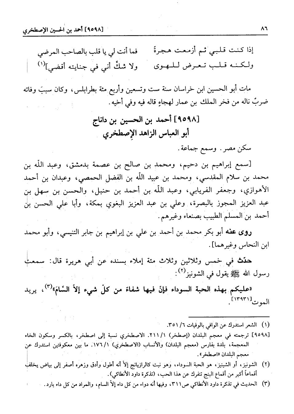 [9598] ترجمته في معجم البلدان (إصطخر) 1/211. الاصطخري نسبة إلى اصطخر، بالكسر وسكون الخاء المعجمة، بلدة بفارس (معجم البلدان) والأنساب (الاصطخري) 1/176. ما بين معكوفتين استدرك عن معجم البلدان «اصطخر» .