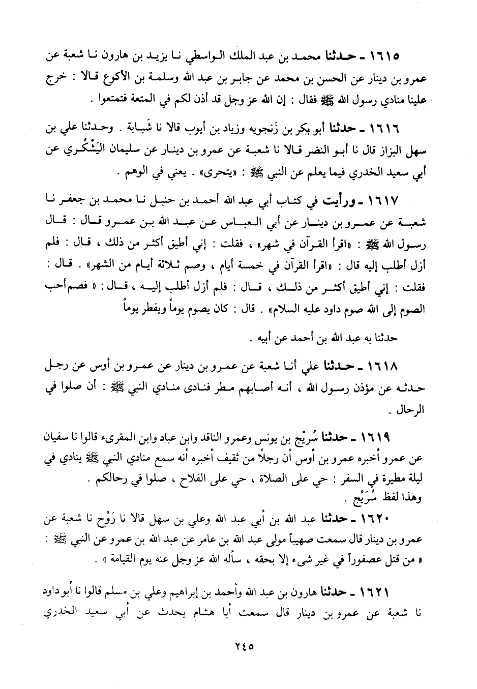 1617 - وَرَأَيْتُ فِيَ كِتَابِ أَبِي عَبْدِ اللَّهِ أَحْمَدَ بْنِ مُحَمَّدِ بْنِ حَنْبَلٍ، نَا مُحَمَّدُ بْنُ جَعْفَرٍ، نَا شُعْبَةُ، عَنْ عَمْرِو بْنِ دِينَارٍ، عَنْ أَبِي الْعَبَّاسِ، عَنْ عَبْدِ اللَّهِ بْنِ عَمْرٍو قَالَ: قَالَ رَسُولُ اللَّهِ صَلَّى اللهُ عَلَيْهِ وَسَلَّمَ: «§اقْرَأِ الْقُرْآنَ فِي شَهْرٍ» فَقُلْتُ: إِنِّي أُطِيقُ أَكْثَرِ مِنْ ذَلِكَ قَالَ: فَلَمْ أَزَلْ أَطْلُبُ إِلَيْهِ حَتَّى قَالَ: «اقْرَأِ الْقُرْآنَ فِي خَمْسَةِ أَيَّامٍ وَصُمْ ثَلَاثَةَ أَيَّامٍ مِنَ الشَّهْرِ» قَالَ: فَقُلْتُ: إِنِّي أُطِيقُ أَكْثَرَ مِنْ ذَلِكَ قَالَ: فَلَمْ أَزَلْ أَطْلُبُ إِلَيْهِ حَتَّى قَالَ: فَصُمْ، أَحَبُّ الصَّوْمِ إِلَى اللَّهِ عَزَّ وَجَلَّ صَوْمُ دَاوُدَ عَلَيْهِ السَّلَامُ قَالَ: كَانَ يَصُومُ يَوْمًا وَيُفْطِرُ يَوْمًا " حَدَّثَنَا بِهِ عَبْدُ اللَّهِ بْنُ أَحْمَدَ عَنْ أَبِيهِ
