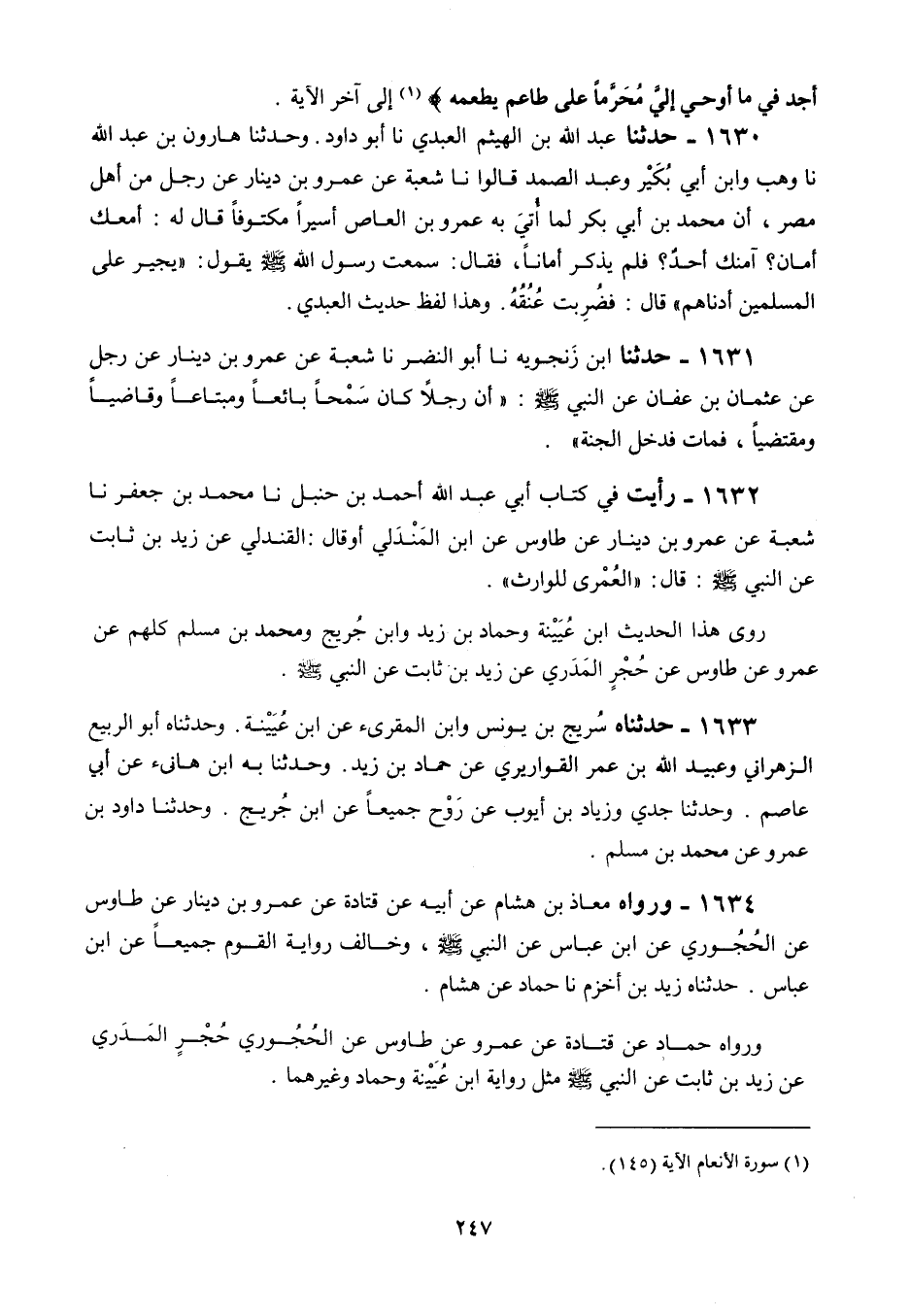 1632 - رَأَيْتُ فِيَ كِتَابِ أَبِي عَبْدِ اللَّهِ أَحْمَدَ بْنِ حَنْبَلٍ، نَا مُحَمَّدُ بْنُ جَعْفَرٍ، نَا شُعْبَةُ، عَنْ عَمْرِو بْنِ دِينَارٍ، عَنْ طَاوُسٍ، عَنِ ابْنِ الْمِنْدِلِيِّ أَوْ قَالَ: الْقِنْدِلِيِّ عَنْ زَيْدِ بْنِ ثَابِتٍ عَنِ النَّبِيِّ صَلَّى اللهُ عَلَيْهِ وَسَلَّمَ قَالَ: «§الْعُمْرَى لِلْوَارِثِ» وَرَوَى هَذَا الْحَدِيثَ ابْنُ عُيَيْنَةَ، وَحَمَّادُ بْنُ زَيْدٍ، وَابْنُ جُرَيْجٍ، وَمُحَمَّدُ بْنُ مُسْلِمٍ كُلُّهُمْ، عَنْ عَمْرٍو، عَنْ طَاوُسٍ، عَنْ حُجْرٍ الْمَدَرِيِّ، عَنْ زَيْدِ بْنِ ثَابِتٍ عَنِ النَّبِيِّ صَلَّى اللهُ عَلَيْهِ وَسَلَّمَ