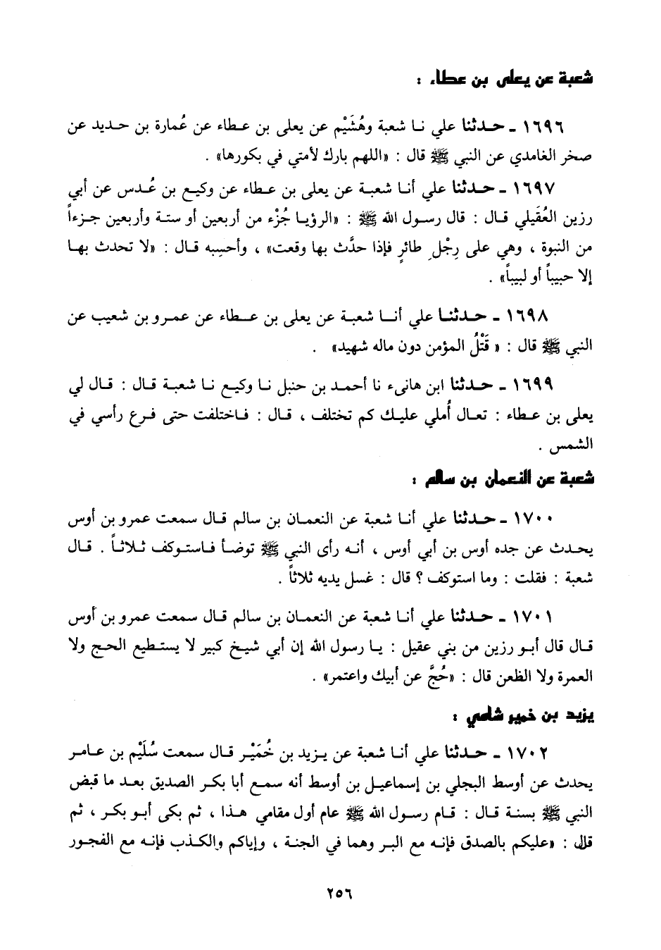 1696 - حَدَّثَنَا عَلِيٌّ، نَا شُعْبَةُ، وَهُشَيْمٌ، عَنْ يَعْلَى بْنِ عَطَاءٍ، عَنْ عُمَارَةَ بْنِ حَدِيدٍ، عَنْ صَخْرٍ الْغَامِدِيِّ عَنِ النَّبِيِّ صَلَّى اللهُ عَلَيْهِ وَسَلَّمَ قَالَ: «اللَّهُمَّ §بَارِكْ لِأُمَّتِي فِي بُكُورِهَا»