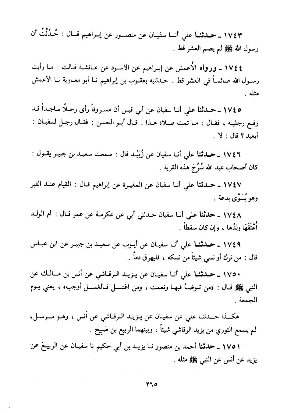 1743 - حَدَّثَنَا عَلِيٌّ، أنَا سُفْيَانُ، عَنْ مَنْصُورٍ، عَنْ إِبْرَاهِيمَ قَالَ: حُدِّثْتُ «أَنَّ رَسُولَ اللَّهِ صَلَّى اللهُ عَلَيْهِ وَسَلَّمَ §لَمْ يَصُمِ الْعَشْرَ قَطُّ»