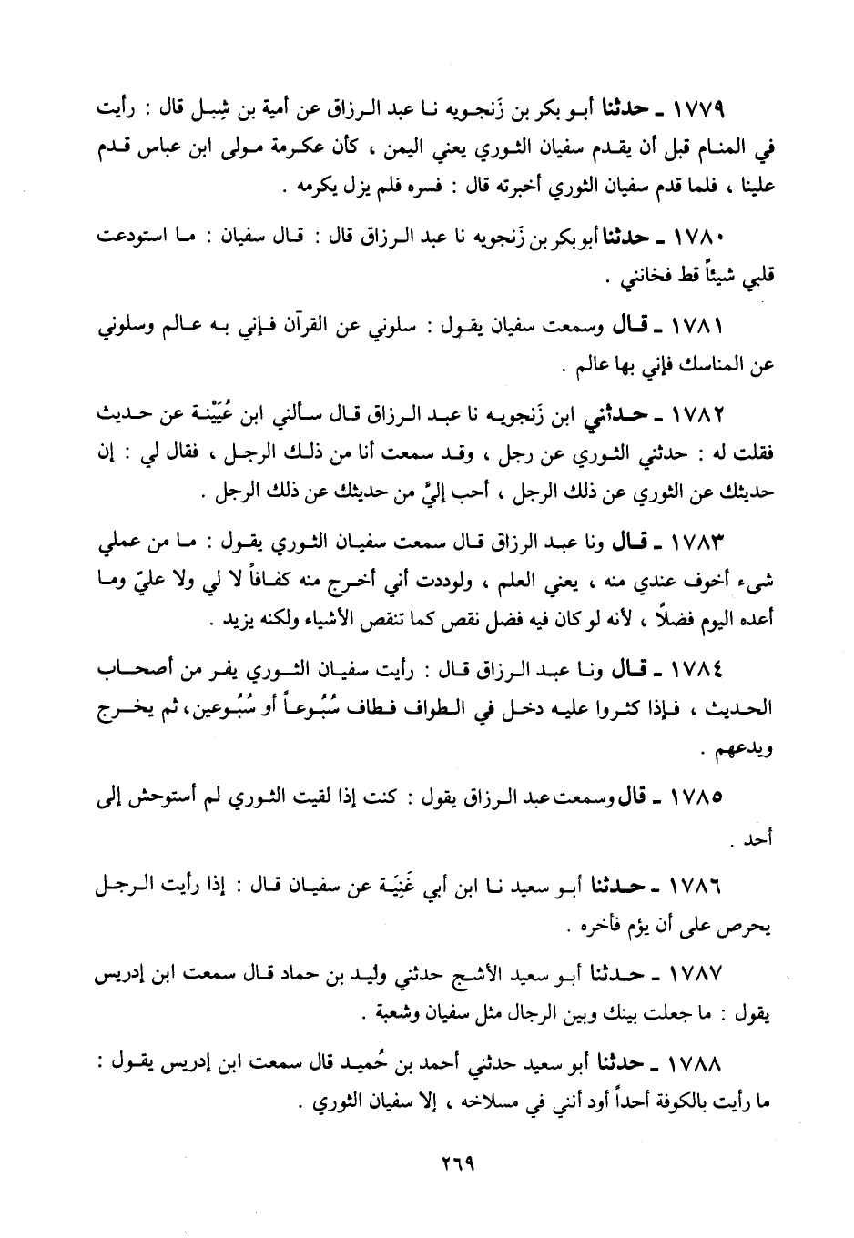 1785 - قَالَ: وَسَمِعْتُ عَبْدَ الرَّزَّاقِ يَقُولُ: «كُنْتُ §إِذَا لَقِيتُ الثَّوْرِيَّ لَمْ أَسْتَوْحِشْ إِلَى أَحَدٍ»