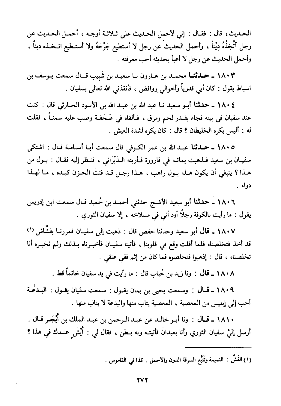 1806 - حَدَّثَنَا أَبُو سَعِيدٍ الْأَشَجُّ، حَدَّثَنِي أَحْمَدُ بْنُ حُمَيْدٍ قَالَ: سَمِعْتُ ابْنَ إِدْرِيسَ يَقُولُ: «§مَا رَأَيْتُ بِالْكُوفَةِ رَجُلًا أَوَدُّ أَنِّي فِي مِسْلَاخِهِ إِلَّا سُفْيَانَ الثَّوْرِيَّ»