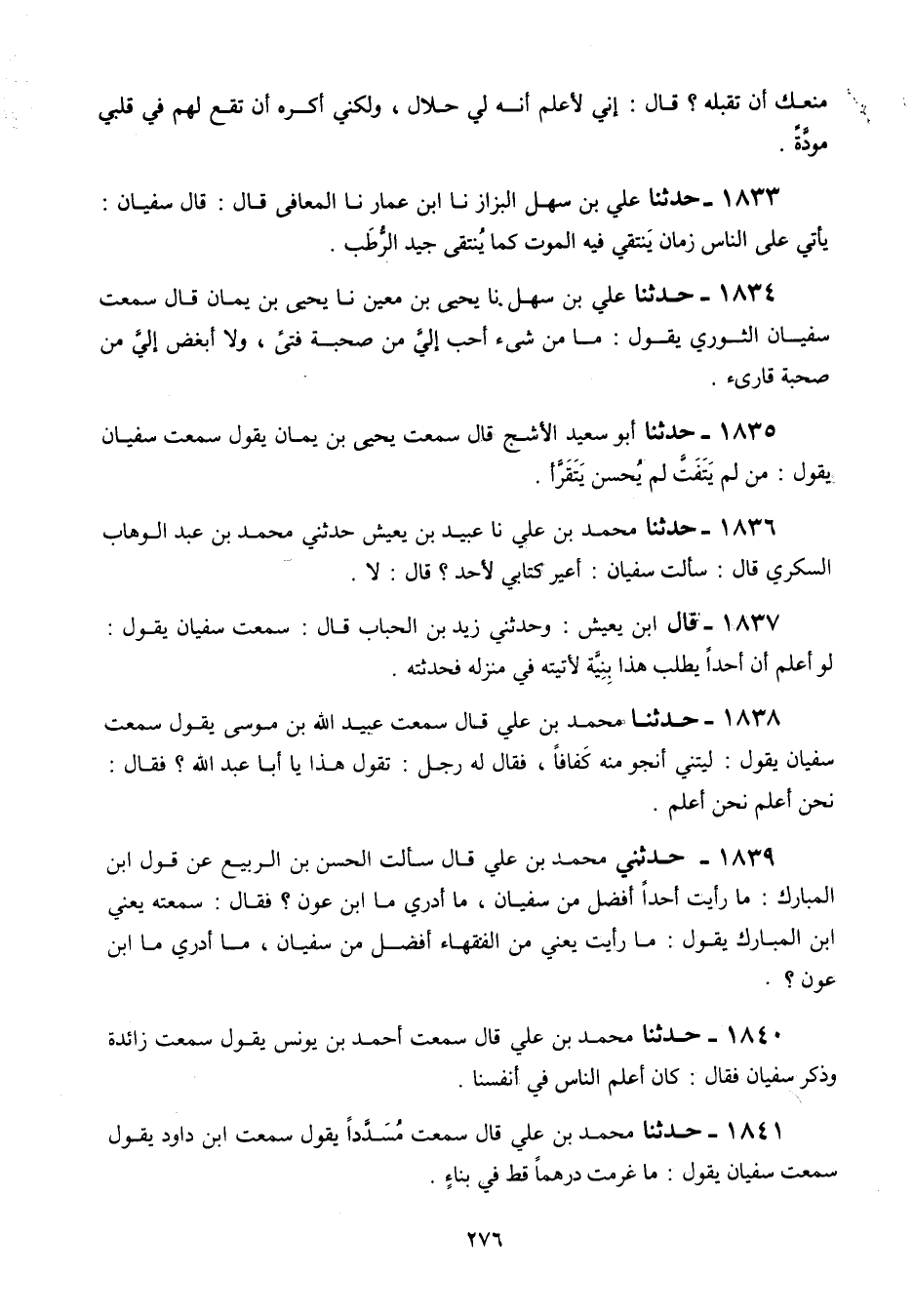 قَالَ ابْنُ يَعِيشَ: وَحَدَّثَنِي زَيْدُ بْنُ الْحُبَابِ قَالَ: سَمِعْتُ سُفْيَانَ يَقُولُ: «§لَوْ أَعْلَمُ أَنَّ أَحَدًا، يَطْلُبُ هَذَا بِنِيَّةٍ لَأَتَيْتُهُ فِي مَنْزِلِهِ فَحَدَّثْتُهُ»
