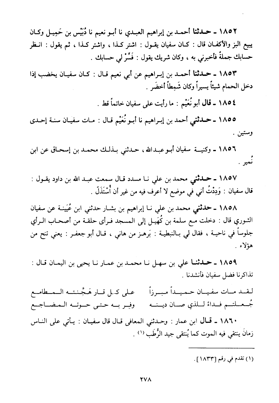 1859 - حَدَّثَنَا عَلِيُّ بْنُ سَهْلٍ، نَا مُحَمَّدُ بْنُ عَمَّارٍ، نَا يَحْيَى بْنُ الْيَمَانِ قَالَ: «§تَذَاكَرْنَا فَضْلَ سُفْيَانَ فَأَنْشَدَنَا