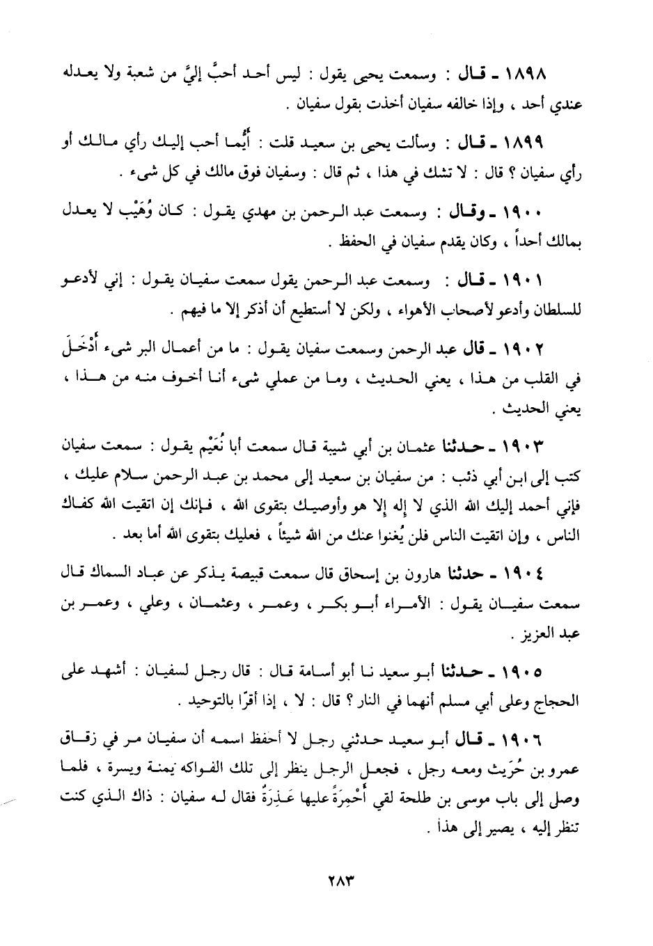 1901 - قَالَ: وَسَمِعْتُ عَبْدَ الرَّحْمَنِ يَقُولُ: سَمِعْتُ سُفْيَانَ يَقُولُ: «إِنِّي §لَأَدْعُو لِلسُّلْطَانِ، وَأَدْعُو لِأَصْحَابِ الْأَهْوَاءِ، وَلَكِنْ لَا أَسْتَطِيعُ أَنْ أَذْكُرَ إِلَّا مَا فِيهِمْ»