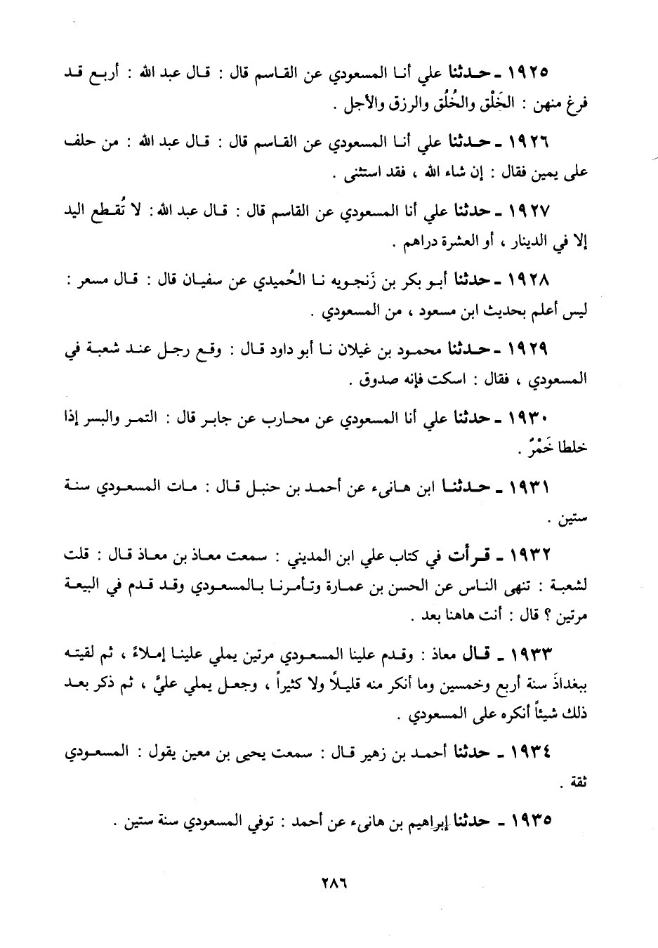 1931 - حَدَّثَنَا إِبْرَاهِيمُ بْنُ هَانِئٍ، عَنْ أَبِي عَبْدِ اللَّهِ أَحْمَدَ بْنِ حَنْبَلٍ قَالَ: «§مَاتَ الْمَسْعُودِيُّ سَنَةَ سِتِّينَ»