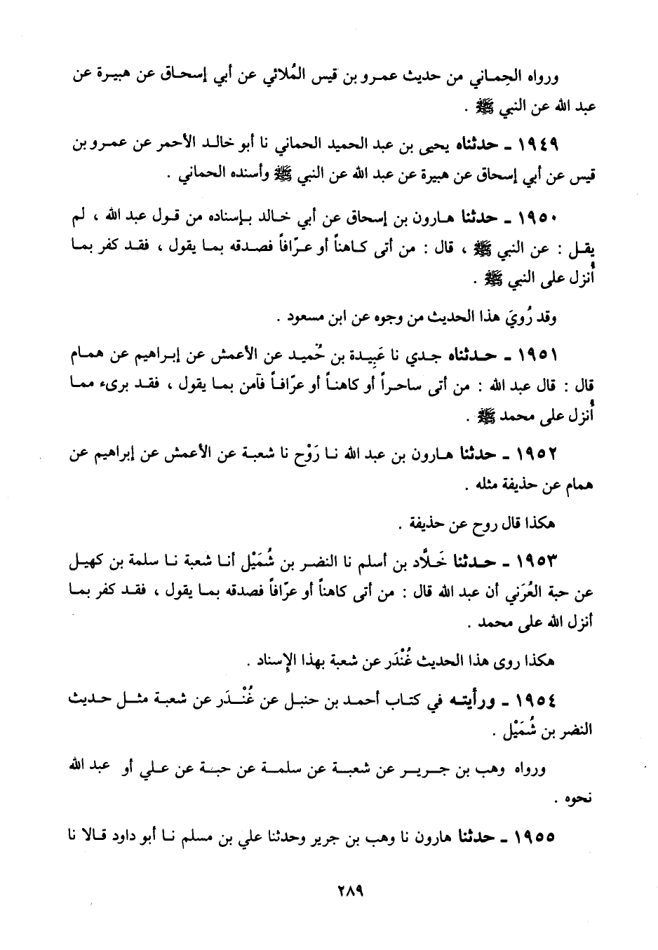 1953 - حَدَّثَنَا خَلَّادُ بْنُ أَسْلَمَ، نَا النَّضْرُ بْنُ شُمَيْلٍ، أنَا شُعْبَةُ، نَا سَلَمَةُ بْنُ كُهَيْلٍ، عَنْ حَبَّةَ الْعُرَنِيِّ، أَنَّ عَبْدَ اللَّهِ قَالَ: " §مَنْ أَتَى كَاهِنًا أَوْ عَرَّافًا فَصَدَّقَهُ بِمَا يَقُولُ فَقَدْ كَفَرَ بِمَا أَنْزَلَ اللَّهُ عَلَى مُحَمَّدٍ صَلَّى اللهُ عَلَيْهِ وَسَلَّمَ هَكَذَا رَوَى هَذَا الْحَدِيثَ غُنْدَرٌ، عَنْ شُعْبَةَ بِهَذَا الْإِسْنَادِ