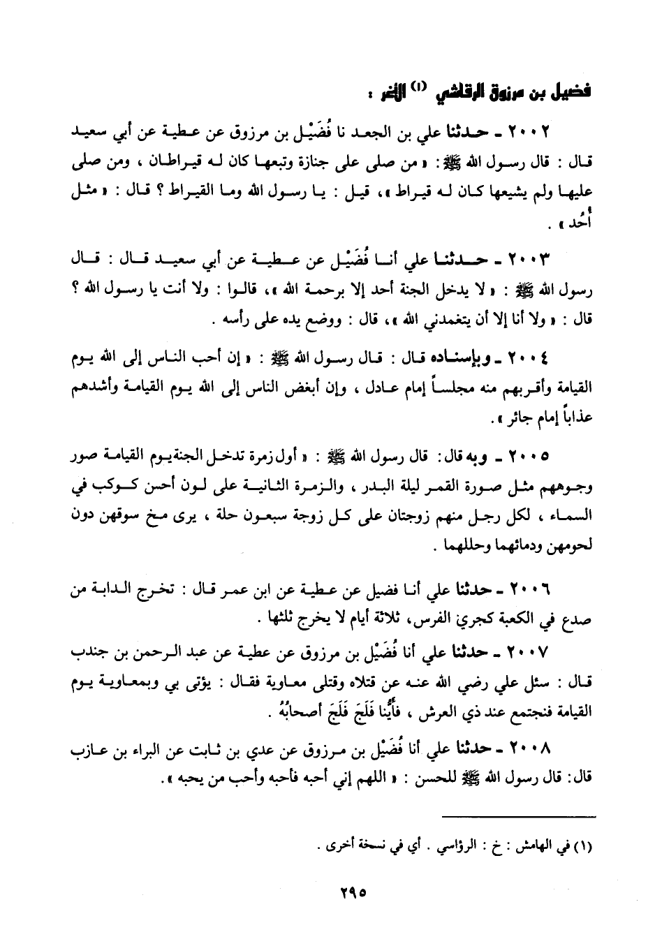 2003 - حَدَّثَنَا عَلِيٌّ، أنَا فُضَيْلُ، عَنْ عَطِيَّةَ، عَنْ أَبِي سَعِيدٍ قَالَ: قَالَ رَسُولُ اللَّهِ صَلَّى اللهُ عَلَيْهِ وَسَلَّمَ: " §لَا يَدْخُلُ الْجَنَّةَ أَحَدٌ إِلَّا بِرَحْمَةِ اللَّهِ قَالُوا: وَلَا أَنْتَ يَا رَسُولَ اللَّهِ قَالَ: وَلَا أنَا إِلَّا أَنْ يَتَغَمَّدَنِيَ اللَّهُ قَالَ: وَوَضَعَ يَدَهُ عَلَى رَأْسِهِ "