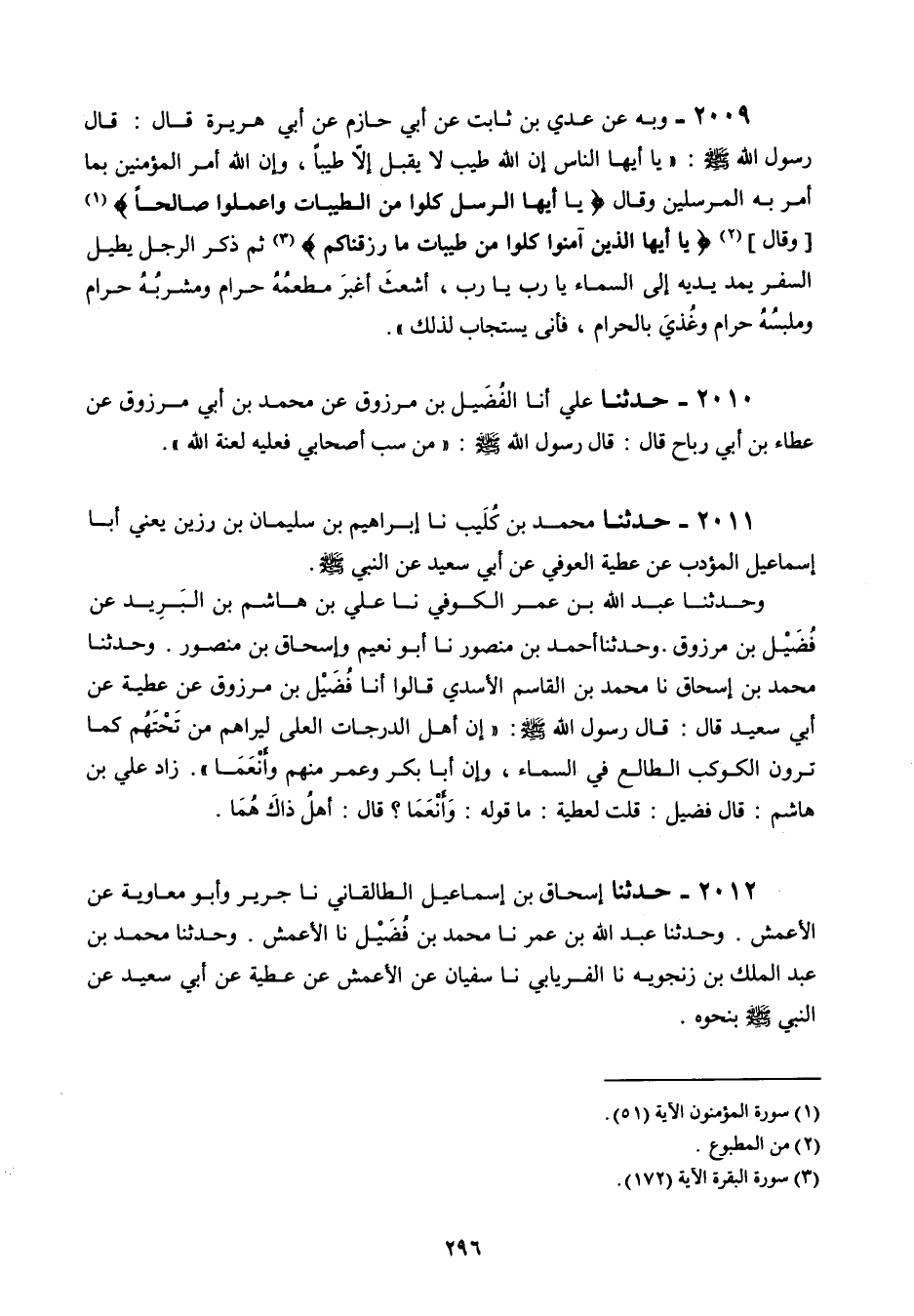 2009 - وَبِهِ عَنْ عَدِيِّ بْنِ ثَابِتٍ، عَنْ أَبِي حَازِمٍ، عَنْ أَبِي هُرَيْرَةَ قَالَ: قَالَ رَسُولُ اللَّهِ صَلَّى اللهُ عَلَيْهِ وَسَلَّمَ: " يَا أَيُّهَا النَّاسُ، إِنَّ §اللَّهَ عَزَّ وَجَلَّ طَيِّبٌ لَا يَقْبَلُ إِلَّا طَيِّبًا، وَإِنَّ اللَّهَ عَزَّ وَجَلَّ أَمَرَ الْمُؤْمِنِينَ بِمَا أَمَرَ بِهِ الْمُرْسَلِينَ، وَقَالَ: {يَا أَيُّهَا الرُّسُلُ كُلُوا مِنَ الطَّيِّبَاتِ وَاعْمَلُوا صَالِحًا} [المؤمنون: 51] وَقَالَ: {يَا أَيُّهَا الَّذِينَ آمَنُوا كُلُوا مِنْ طَيِّبَاتِ مَا رَزَقْنَاكُمْ} [البقرة: 172] ثُمَّ ذَكَرَ الرَّجُلُ يُطِيلُ السَّفَرَ يَمُدُّ يَدَيْهِ إِلَى السَّمَاءِ، يَا رَبِّ يَا رَبِّ أَشْعَثَ أَغْبَرَ، مَطْعَمُهُ حَرَامٌ، وَمَشْرَبُهُ حَرَامٌ، وَمَلْبَسُهُ حَرَامٌ، وَغُذِّيَ بِالْحَرَامِ، فَأَنَّى يُسْتَجَابُ لِذَلِكَ "