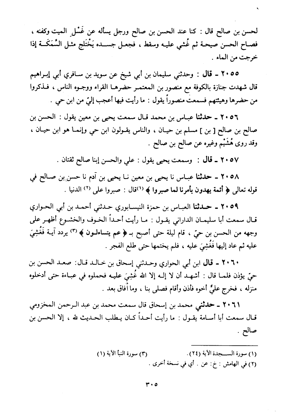 2058 - حَدَّثَنَا عَبَّاسٌ، نَا يَحْيَى بْنُ مَعِينٍ، نَا يَحْيَى بْنُ آدَمَ، نَا حَسَنُ بْنُ صَالِحٍ، فِي قَوْلُهُ تَعَالَى: {§أَئِمَّةٌ يُهْدُونَ بِأَمْرِنَا لَمَّا صَبَرُوا} [السجدة: 24] قَالَ: «صَبَرُوا عَلَى الدُّنْيَا»