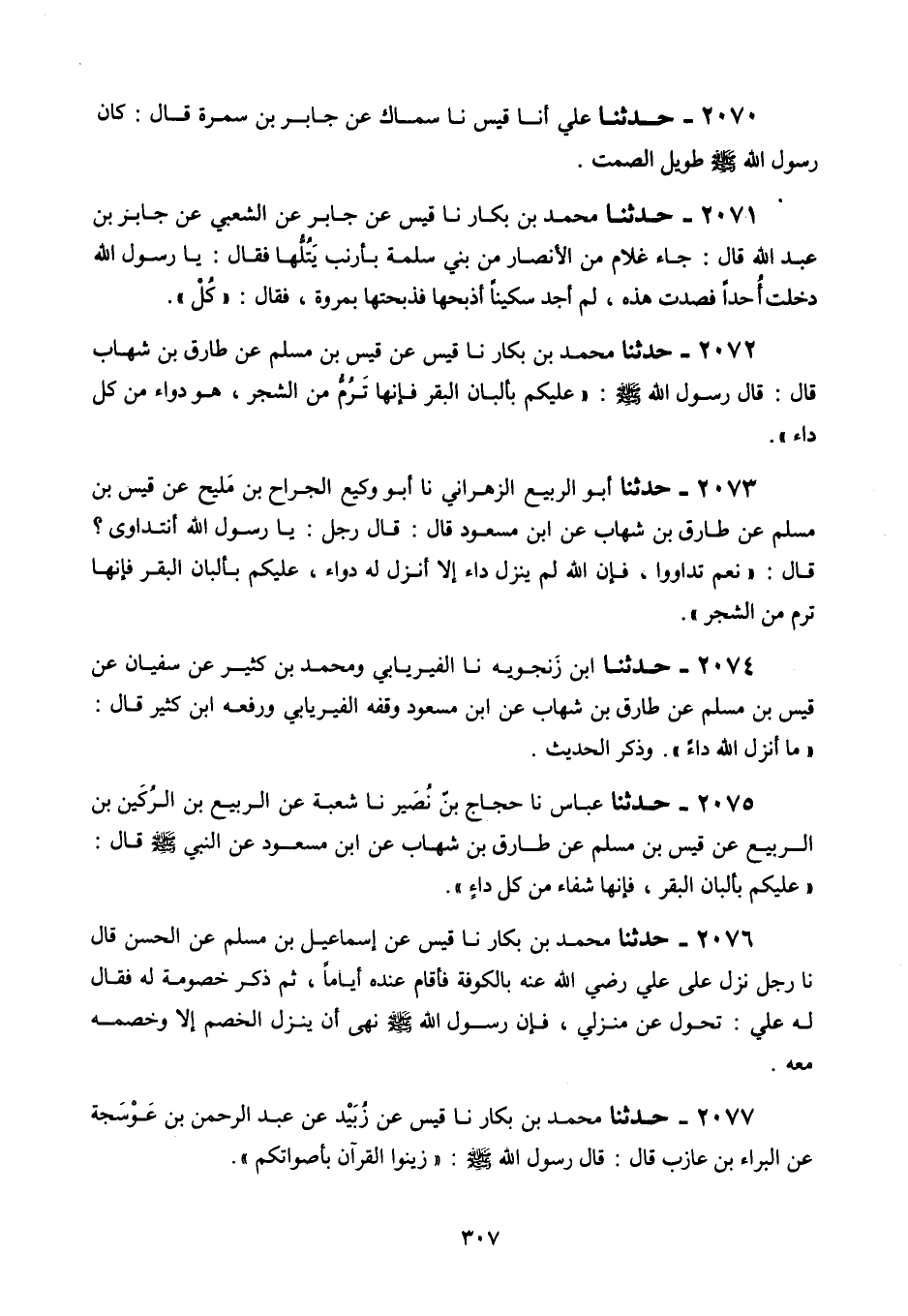 2072 - حَدَّثَنَا مُحَمَّدُ بْنُ بَكَّارٍ، نَا قَيْسٌ، عَنْ قَيْسِ بْنِ مُسْلِمٍ، عَنْ طَارِقِ بْنِ شِهَابٍ قَالَ: قَالَ رَسُولُ اللَّهِ صَلَّى اللهُ عَلَيْهِ وَسَلَّمَ: «§عَلَيْكُمْ بِأَلْبَانِ الْبَقَرِ، فَإِنَّهَا تَرُمُّ مِنَ الشَّجَرِ هُوَ دَوَاءٌ مِنْ كُلِّ دَاءٍ»