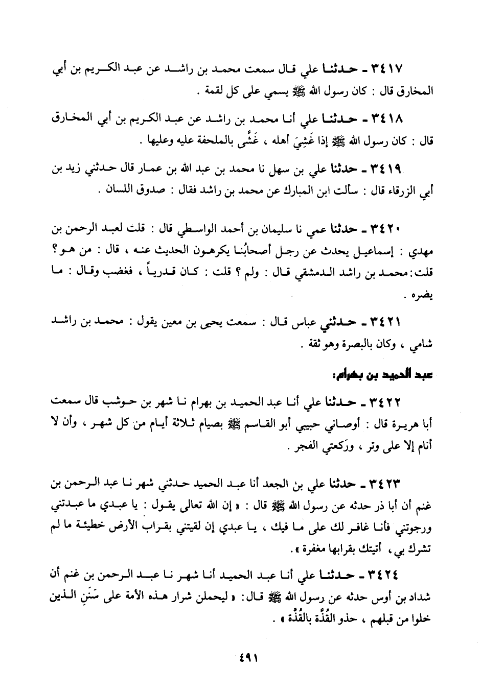 3420 - حَدَّثَنَا عَمِّي، نَا سُلَيْمَانُ بْنُ أَحْمَدَ الْوَاسِطِيُّ قَالَ: قُلْتُ لِعَبْدِ الرَّحْمَنِ بْنِ مَهْدِيٍّ " §إِسْمَاعِيلُ يُحَدِّثُ عَنْ رَجُلٍ، أَصْحَابُنَا يَكْرَهُونَ الْحَدِيثَ عَنْهُ قَالَ: مَنْ هُوَ؟ قُلْتُ: مُحَمَّدُ بْنُ رَاشِدٍ الدِّمَشْقِيُّ قَالَ: وَلِمَ؟ قُلْتُ: كَانَ قَدَرِيًّا فَغَضِبَ، وَقَالَ: مَا يَضُرَّهُ "
