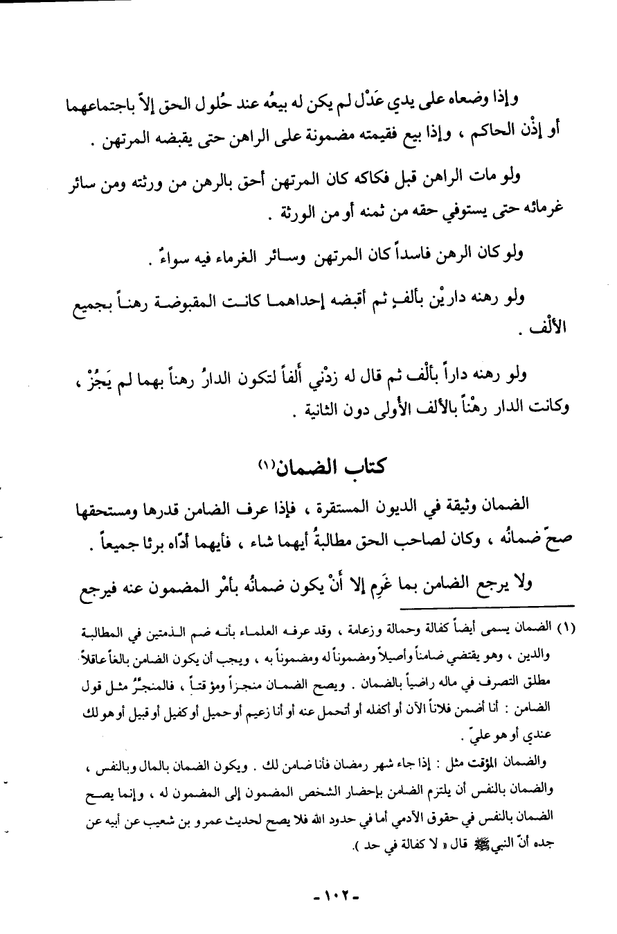 كتاب الضَّمَان الضَّمَان وَثِيقَة فِي الدجيون المستقرة فَإِذا عرف الضَّامِن قدرهَا ومستحقها صَحَّ ضَمَانه وَكَانَ لصَاحب مطالة أَيهمَا شَاءَ فَأَيّهمَا أَدَّاهُ برئا جَمِيعًا وَلَا يرجع لضامن بِمَا غرم إِلَّا أَن يكون ضَمَانه بِأَمْر الْمَضْمُون عَنهُ فَيرجع