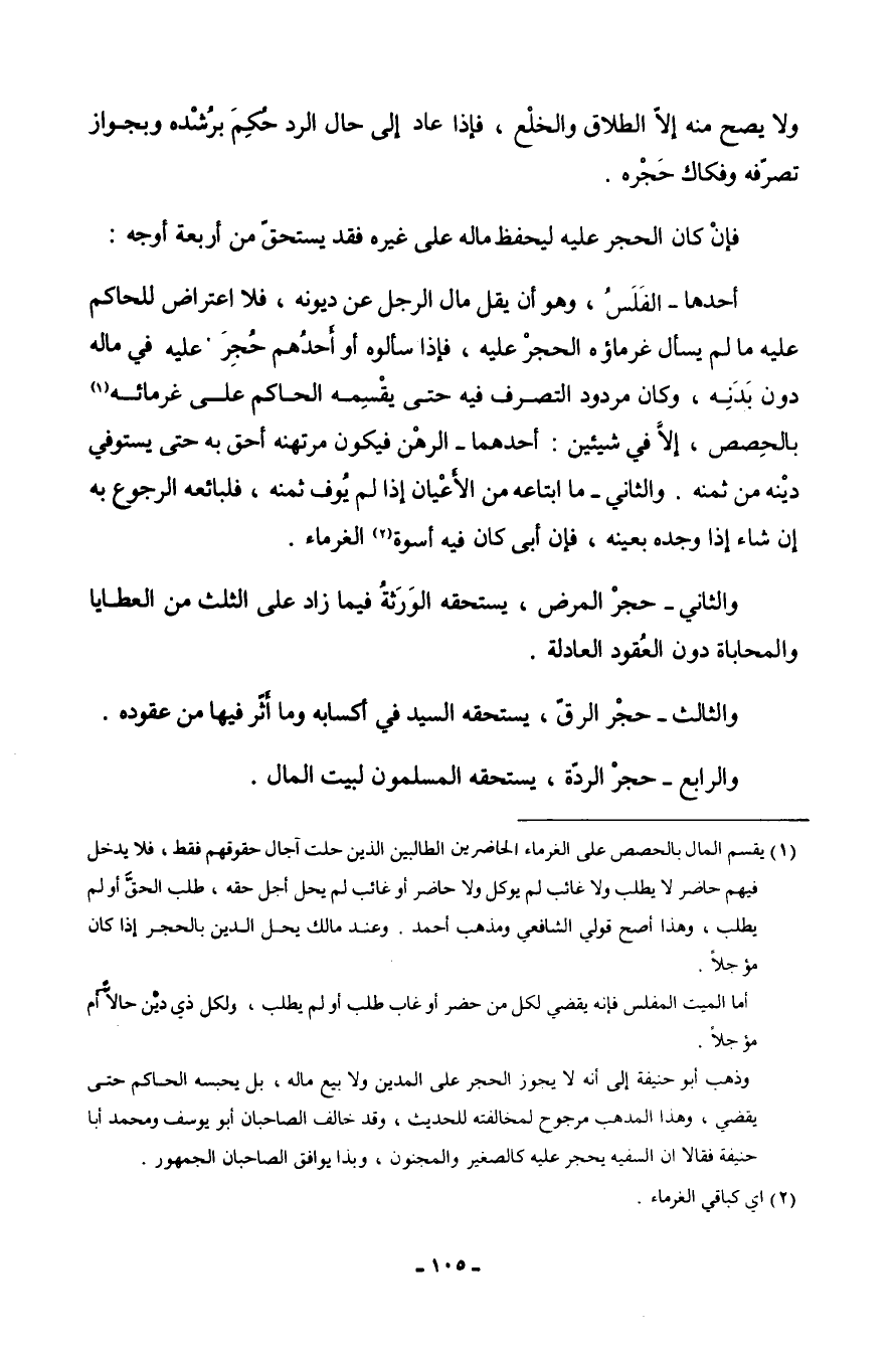 وَلَا يَصح مِنْهُ إِلَّا الطَّلَاق وَالْخلْع فَإِذا عَاد إِلَى حَال الرَّد حكم برشده وبجواز تصرفه وفكاك حجره فَإِن كَانَ الْحجر عَلَيْهِ ليحفظ مَاله على غَيره فقد يسْتَحق من أَرْبَعَة أوجه أَحدهَا الْفلس وَهُوَ أَن يقل مَال الرجل عَن دُيُونه فَلَا اعْتِرَاض للْحَاكِم عَلَيْهِ مَا لم يسْأَل غرماؤه الْحجر عَلَيْهِ فَإِذا سَأَلُوهُ أَو أحدهم حجر عَلَيْهِ فِي مَاله دون بدنه وَكَانَ مَرْدُود التَّصَرُّف فِيهِ حَتَّى يقسمهُ الْحَاكِم على غُرَمَائه بِالْحِصَصِ إِلَّا فِي شَيْئَيْنِ أَحدهمَا الرَّهْن فَيكون مرتهنه أَحَق بِهِ حَتَّى يَسْتَوْفِي دنه من ثمنه وَالثَّانِي مَا ابتاعه من الْأَعْيَان إِذا لم يوف ثمنه فلبائع الرُّجُوع بِهِ إِن شَاءَ إِذا وجده بِعَيْنِه فَإِن أَبى كَانَ فِيهِ أُسْوَة الْغُرَمَاء وَالثَّانِي حجر الْمَرَض يسْتَحقّهُ الْوَرَثَة فِيمَا زَاد على الثُّلُث من العطايا والمحاباة دون الْعُقُود العادلة وَالثَّالِث حجر الرّقّ يسْتَحقّهُ السَّيِّد فِي أكسابه وَمَا أثر فِيهَا من عقوده والرابه حجر الرِّدَّة يسْتَحقّهُ الْمُسلمُونَ لبيت المَال