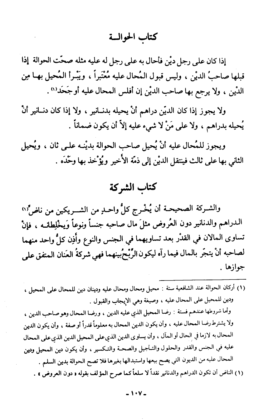 بَاب الشّركَة وَالشَّرِكَة الصَّحِيحَة أَن يخرج كل وَاحِد من الشَّرِيكَيْنِ من ناض الدَّرَاهِم وَالدَّنَانِير دون الْعرُوض مثل مَال صَاحبه جِنْسا ونوعا ويخاطانه فَإِن تساوى المالان فِي الْقدر بعد تساويهما فِي الْجِنْس وَالنَّوْع وَأذن كل وَاحِد مِنْهُمَا لصاحه أَن يتجر بِالْمَالِ فِيمَا رَآهُ ليَكُون الرِّبْح بَينهمَا فَهِيَ شركَة الْعَنَان الْمُتَّفق على جَوَازهَا