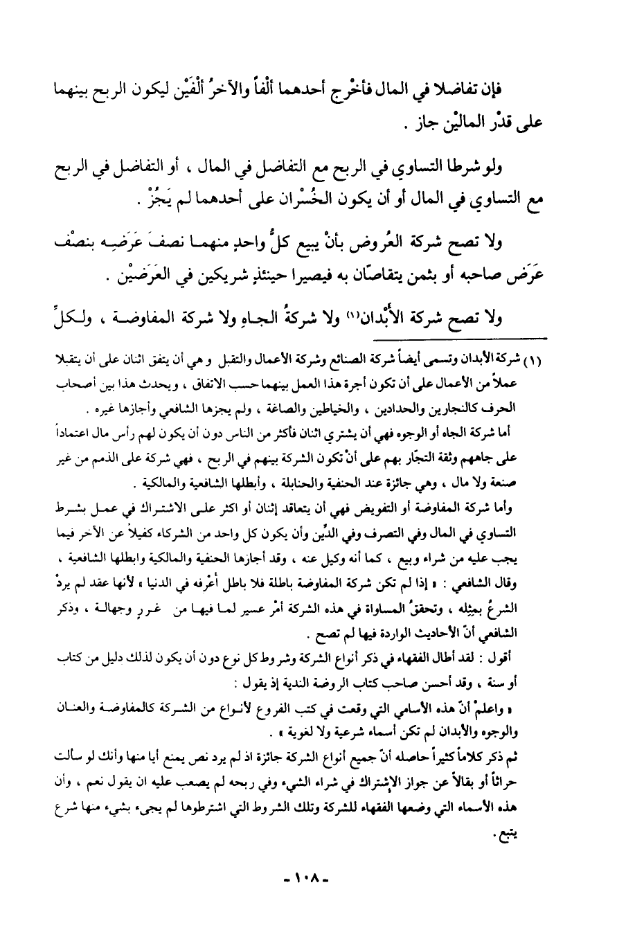 فَإِن تفاضلا فِي المَال فَأخْرج أَحدهمَا ألفا وَالْآخر أَلفَيْنِ ليَكُون الرِّبْح بَينهمَا على قدر الْمَالَيْنِ جَازَ وَلَو شرطا التَّسَاوِي فِي الرِّبْح مَعَ التَّفَاضُل فِي المَال أَو التَّفَاضُل فِي الرِّبْح مَعَ التَّسَاوِي فِي المَال أَو أَن يمون الخسران على أَحدهمَا لم يجز وَلَا تصح شركَة الْعرُوض بِأَن يَبِيع كل وَاحِد مِنْهُمَا نصف عرضه بِنصْف عرض صَاحبه أَو بِثمن يتقاصان بِهِ فيصيرا حِينَئِذٍ شَرِيكَيْنِ فِي العرضين وَلَا تصح شركَة الْأَبدَان وَلَا شركَة الجاه وَلَا شركَة الْمُفَاوضَة وَلكُل