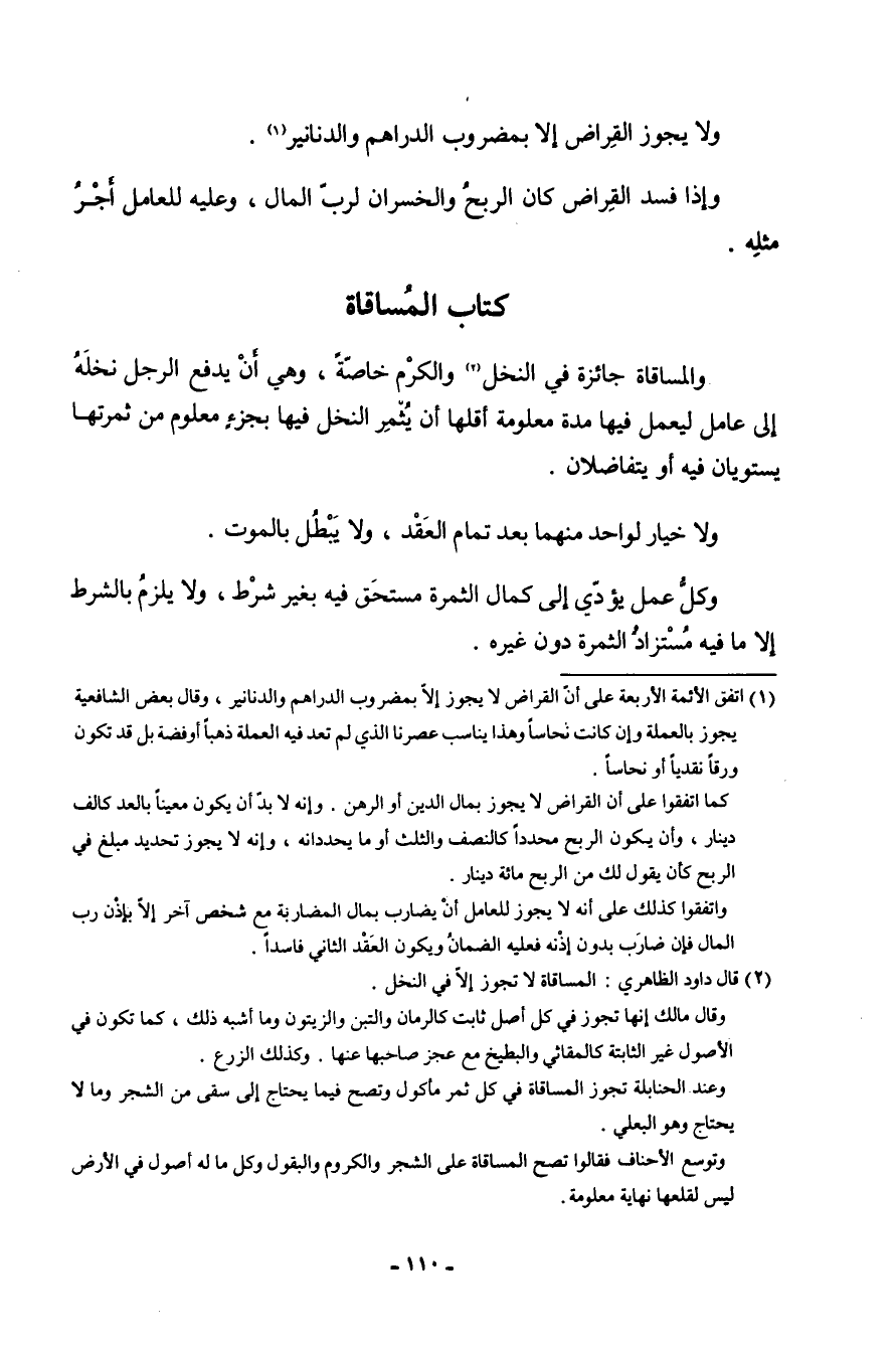 كتاب الْمُسَاقَاة وَالْمُسَاقَاة جَائِزَة فِي النّخل وَالْكَرم خَاصَّة وَهِي أَن يدْفع الرجل نخله إِلَى عَامل ليعْمَل فِيهَا مُدَّة مَعْلُومَة أقلهَا أَن يُثمر النّخل فِيهَا بِجُزْء مَعْلُوم من ثَمَرَتهَا يستويان فِيهِ أَو يتفاضلان وَلَا خِيَار لوَاحِد مِنْهُمَا بعد تَمام العقد وزلا يبطل بِالْمَوْتِ وكل عملؤدي إِلَى كَمَال الثَّمَرَة مُسْتَحقّ فِيهِ بِغَيْر شَرط وَلَا يلْزم بِالشّرطِ إِلَّا مَا فِيهِ مستزاد الثَّمَرَة دون غَيره