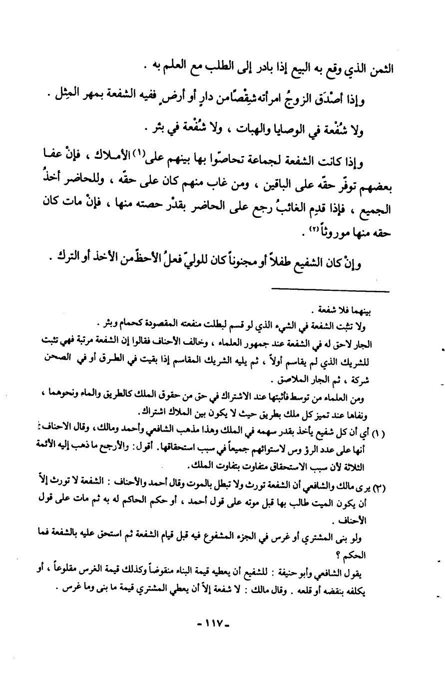 الثّمن الَّذِي وَقع بِهِ البيع إِذا بَادر إِلَى الطّلب مَعَ الْعلم بِهِ وَإِذا أصدق الزَّوْج امْرَأَته شِقْصا من دَار أَو أَرض فَفِيهِ الشُّفْعَة بِمهْر الْمثل وَلَا شُفْعَة فِي الْوَصَايَا والهبات وَلَا شُفْعَة فِي بِئْر وَإِذ كَانَت الشُّفْعَة لجَماعَة تحاصوا بهَا بَينهم على الْأَمْلَاك فَإِن عَفا بَعضهم توفر حَقه على البَاقِينَ وَمن غَابَ مِنْهُم كَانَ على حَقه وللحاضر أَخذ الْجَمِيع فَإِذا قدم الْغَائِب رَجَعَ على الْحَاضِر بِقدر حِصَّته مِنْهَا فَإِن مَاتَ كَانَ حَقه موروثا وَإِن كَانَ الشَّفِيع طفْلا أَو مَجْنُونا كَانَ للْوَلِيّ فعل الأحظ من الْأَخْذ أَو التّرْك