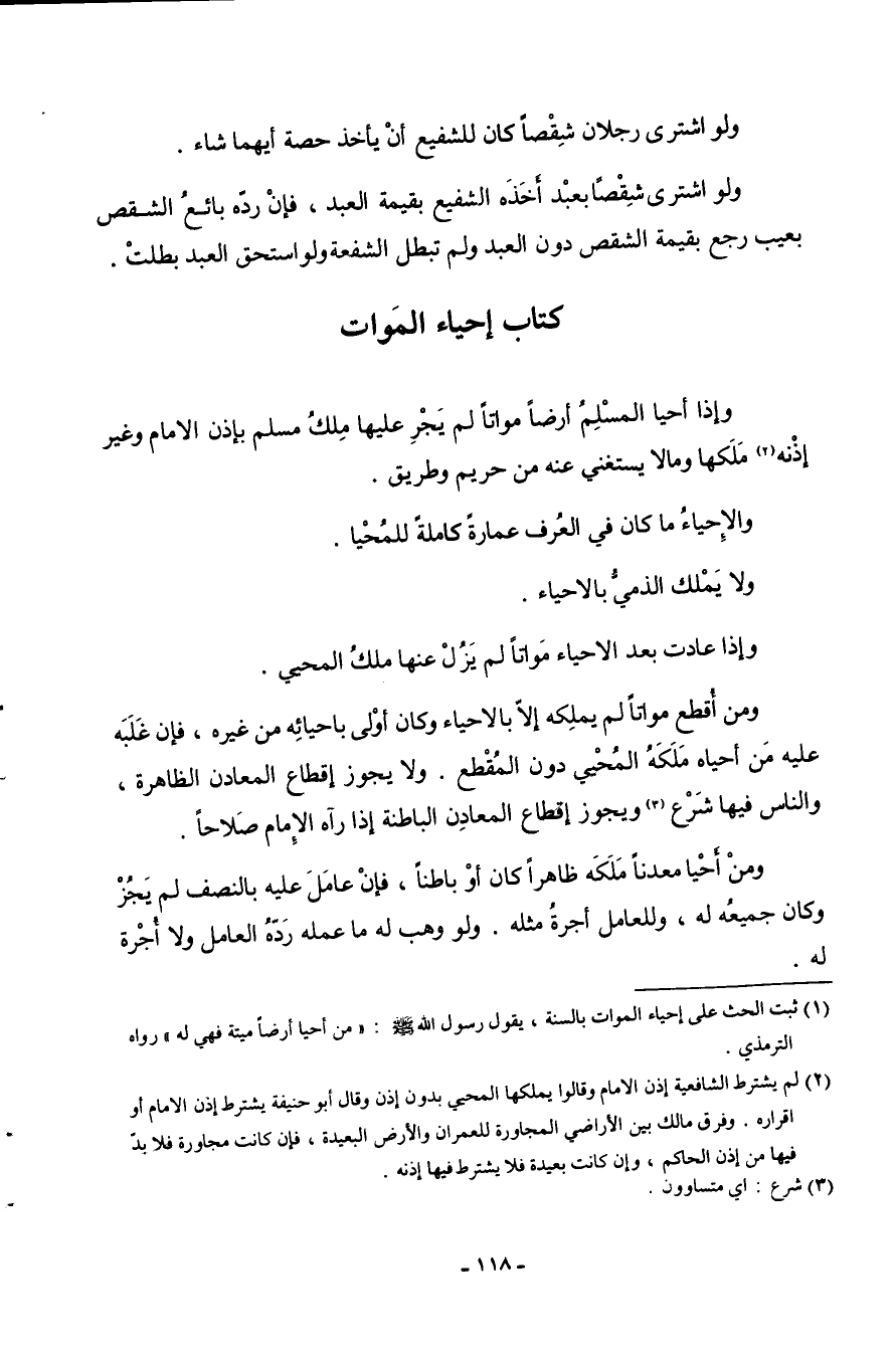 كتاب إحْيَاء الْموَات وَإِذا أَحْيَا الْمُسلم أَرضًا مواتا لم يجر عَلَيْهَا ملك مُسلم بِإِذن الإِمَام وَغير إِذْنه ملكهَا ومالا يسْتَغْنى عَنهُ من حَرِيم وَطَرِيق والإحياء مَا كَانَ فِي الْعرف عمَارَة كَامِلَة للمحيا وَلَا يملك الذِّمِّيّ بالاحياء وَإِذا عَادَتْ بعد الْأَحْيَاء مواتا لم يزل عَنْهَا ملك المحيي وَمن أقطع مواتا لم نيملكه إِلَّا بالاحياء وَكَانَ أولى بإحيائه من غَيره فَإِن غللبه عَلَيْهِ من أَحْيَاهُ ملكه المحيي دون المقطع وَلَا يجوز إقطاع الْمَعَادِن الظَّاهِرَة وَالنَّاس فِيهَا شرع وَيجوز إقطاع الْمَعَادِن الْبَاطِنَة إِذا رَآهُ الإِمَام صلاحا وَمن أَحْيَا معدنا ظَاهرا أَو بَاطِنا فَإِن عَامل عَلَيْهِ بِالنِّصْفِ لم يجز وَكَانَ جَمِيعه لَهُ وللعامل أُجْرَة مثله وَلَو وهب لَهُ مَا عمله رده الْعَامِل وَلَا أُجْرَة لَهُ