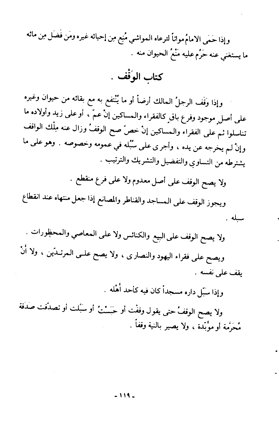 كتاب الْوَقْف وإذاوقف الرجل الْمَالِك أَرضًا أَو مَا ينْتَفع بِهِ مَعَ بَقَائِهِ من حَيَوَان وَغَيره على اصل مَوْجُود وَفرع بَاقٍ كالفقراء وَالْمَسَاكِين إِن خص صَحَّ الْوَقْف وَزَالَ عَنهُ ملك الْوَاقِف وَإِن لم يُخرجهُ عَن يَده وأجرى على سبله فِي عُمُومه وخصوصه وَهُوَ على مَا يَشْتَرِطه من التَّسَاوِي والتفضيل والتشريك وَالتَّرْتِيب وَلَا يَصح الْوَقْف على أصل مَعْدُوم وَلَا على فرع مُنْقَطع وَيجوز الْوَقْف على الْمَسَاجِد والقناطر والمصانع إِذا جعل منتهاه عِنْد انْقِطَاع سبله وَلَا يَصح الْوَقْف على البيع وَالْكَنَائِس وَلَا على الْمعاصِي والحظورات وَيصِح على فُقَرَاء الْيَهُود وَالنَّصَارَى وَلَا يَصح على الْمُرْتَدين وَلَا أَن يقف على نَفسه وَإِذا سبل دَاره مَسْجِدا كَانَ فِيهِ كَأحد أَهله وَلَا يَصح الْوَقْف حَتَّى يَقُول وقفت أَو حبست أَو سبلت أَو تَصَدَّقت صَدَقَة مُحرمَة أَو مُؤَبّدَة وَلَا يصير بِالنِّيَّةِ وَقفا