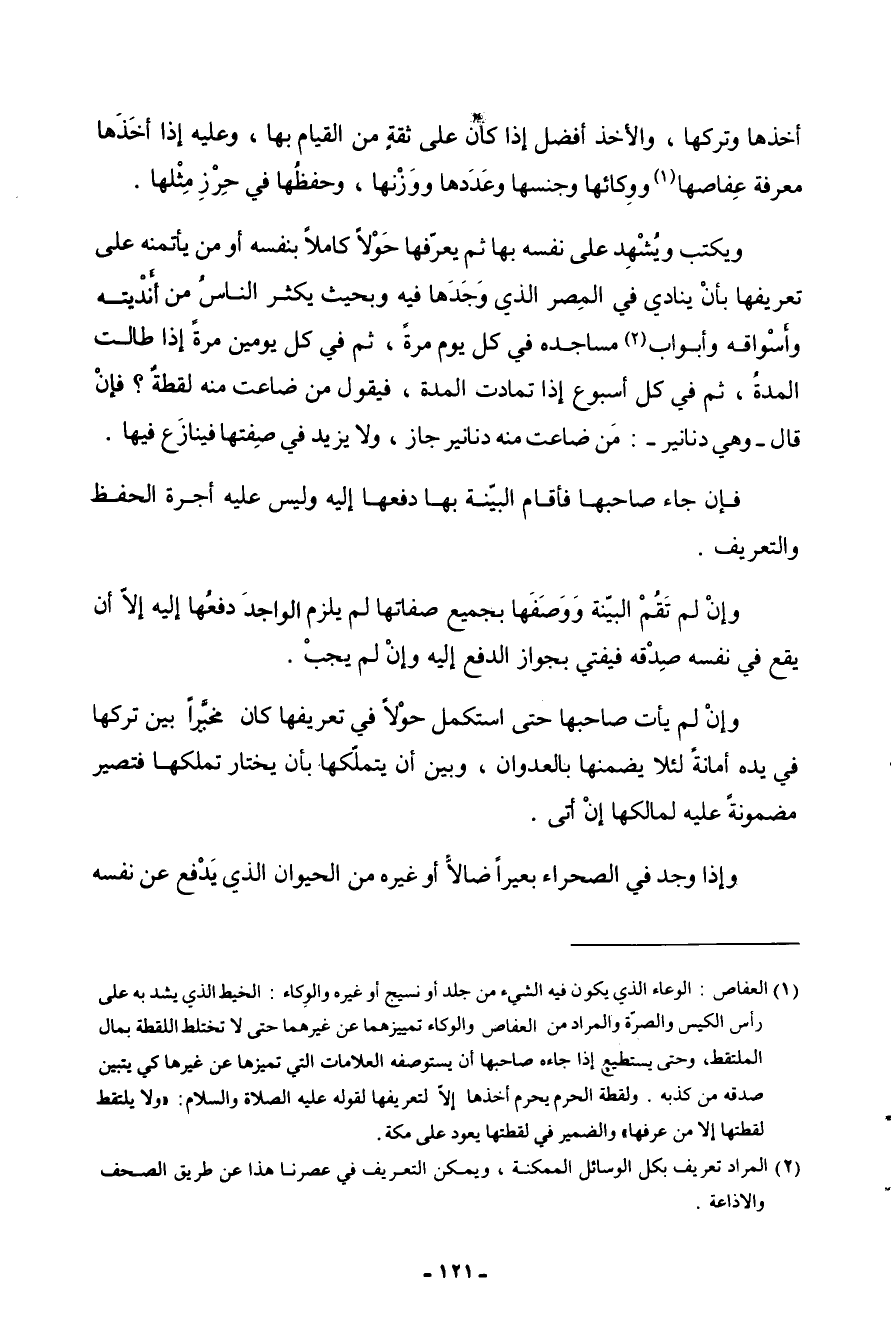 أَخذهَا وَتركهَا وَالْأَخْذ أفضل إِن كَانَ على ثِقَة من الْقيام بهَا وَعَلِيهِ إِذا أَخذهَا معرفَة عفاصها ووكائها وجنسها وعددها ووزنها وحفظها فِي حرز مثلهَا وَيكْتب وَيشْهد على نَفسه بهَا ثمَّ يعرفهَا حولا كَامِلا بِنَفسِهِ أَو من يأتمنه على تَعْرِيفهَا بِأَن يُنَادي فِي الْمصر الَّذِي وجدهَا فِيهِ وبحيث يكثر النَّاس من أنديته وأسواقه وأبواب مساجده فِي كل يَوْم مرّة ثمَّ فِي كل يويمين مرّة إِذا طَالَتْ الْمدَّة ثمَّ فِي كل أُسْبُوع إِذا تمادت الْمدَّة فَيَقُول من ضَاعَت مِنْهُ لقطَة فَإِن قَالَ وَهِي دَنَانِير من ضَاعَت مِنْهُ دَنَانِير وَجَاز وَلَا يزِيد فِي صفتهَا فينازع فِيهَا فَإِن جَاءَ صَاحبهَا فَأَقَامَ الْبَيِّنَة بهَا دَفعهَا إِلَيْهِ وَلَيْسَ عَلَيْهِ أُجْرَة الْحِفْظ والتعريف وَإِن لم تقم الْبَيِّنَة ووصفها بِجَمِيعِ صفاتها لم يلْزم الْوَاجِد دَفعهَا إِلَيْهِ إِلَّا أَن يَقع فِي نَفسه صدقه فيفتي بِجَوَاز الدّفع إِلَيْهِ وَإِن لم يجب وَإِن لم يَأْتِ صَاحبهَا حَتَّى اسْتكْمل حولا فِي تَعْرِيفهَا كَانَ مُخَيّرا بَين تَركهَا فِي يَده أَمَانَة لِئَلَّا يضمنهَا بالعدوان وَبَين أَن يمتلكها بِأَن يخْتَار تَملكهَا فَتَصِير مَضْمُونَة عَلَيْهِ لمَالِكهَا إِن أَتَى وَإِذا وجد فِي الصَّحرَاء بَعِيرًا ضَالًّا أَو غَيره من الْحَيَوَان الَّذِي يدْفع عَن نَفسه