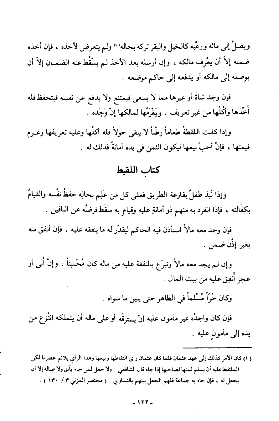 ويصل إِلَى مائَة ورعيه كالخيل وَالْبَقر تَركه بِحَالهِ وَلم يتَعَرَّض لأَخذه فَإِن أَخذه ضمنه إِلَّا أَن يعرفة مَالِكه وَإِن أرْسلهُ بعد الْأَخْذ لم يسْقط عَنهُ الضَّمَان إِلَّا أَن يوصله إِلَى مَالِكه أَو يَدْفَعهُ إِلَى حَاكم مَوْضِعه فَإِن وجد شَاة أَو غَيرهَا مِمَّا لَا يسْعَى فَيمْتَنع وَلَا يدْفع عَن نَفسه فيحتفظ فَلهُ أَخذهَا وأكلها من غير تَعْرِيف ويغرمها لمَالِكهَا إِن وجده وَإِذا كَانَت اللّقطَة طَعَاما رطبا لَا يبْقى حولا فَلهُ أكله وَعَلِيهِ تَعْرِيفهَا وَغرم قيمتهَا فَإِن أحب بيعهَا ليَكُون الثّمن فِي يَده أَمَانَة فَذَلِك لَهُ