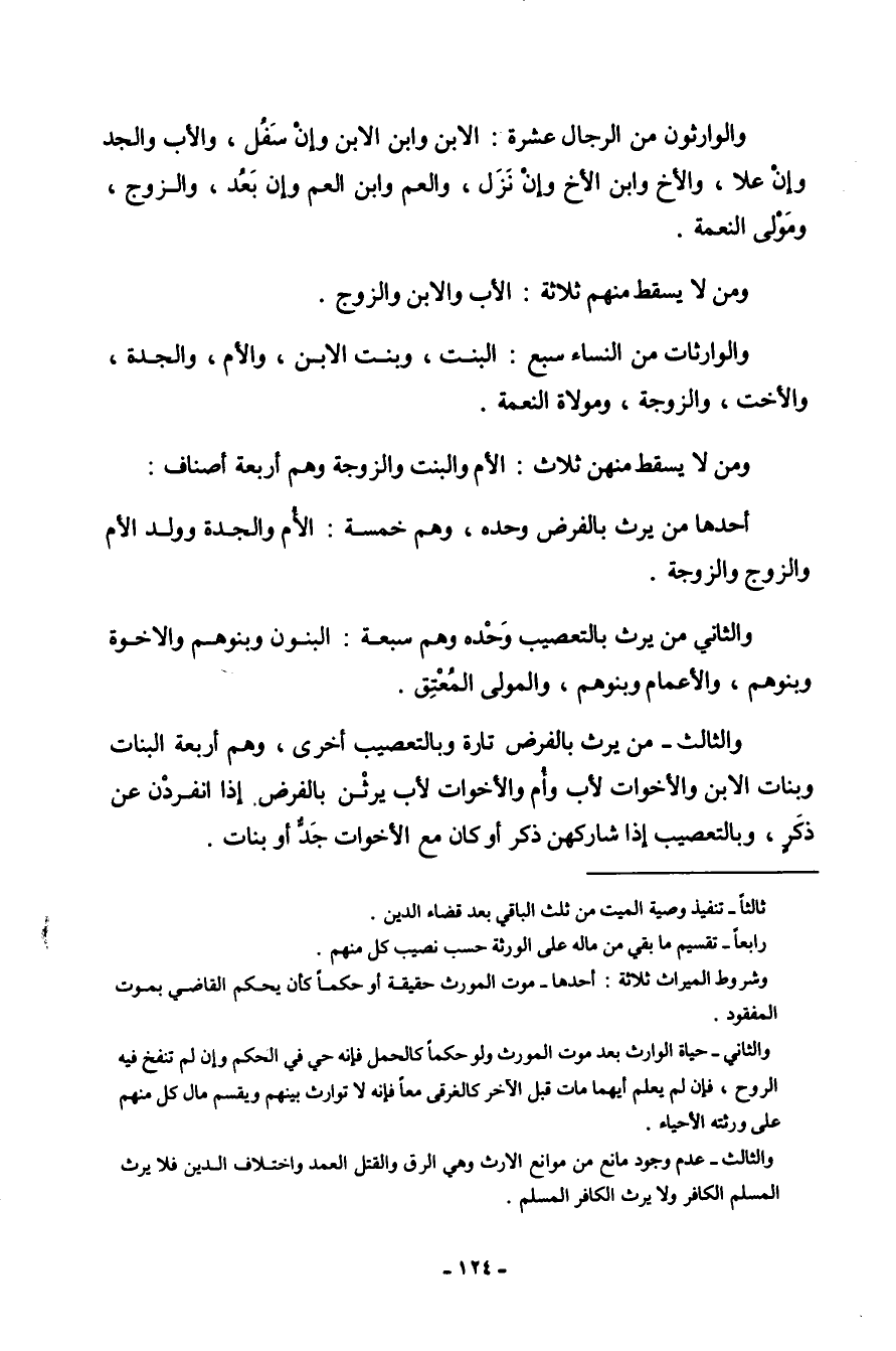 والوارثون من الرِّجَال عشرَة الابْن وَابْن الابْن وَإِن سفل وَالْأَب وَالْجد وَإِن علا وَالْأَخ وَابْن الْأَخ وَإِن نزل وَالْعم وَابْن الْعم وَإِن بعد وَالزَّوْج وَمولى النِّعْمَة وَمن لَا يسْقط مِنْهُم ثَلَاثَة الْأَب وَالِابْن وَالزَّوْج والوارثات من انساء سبع الْبِنْت وَبنت الابْن وَالأُم وَالْجدّة وَالْأُخْت وَالزَّوْجَة ومولاة النِّعْمَة وَمن لَا يسْقط مِنْهُنَّ ثَلَاث الْأُم وَالْبِنْت والزوحجة وَهُوَ أَرْبَعَة أَصْنَاف أَحدهَا من يَرث بِالْفَرْضِ وَحده وهم خَمْسَة الْأُم وَالْجدّة وَولد الْأُم وَالزَّوْج وَالزَّوْجَة وَالثَّانِي من يَرث بِالتَّعْصِيبِ وَحده وهم سَبْعَة البنون وبنوهم والاخوة وبنوهم والأعمام وبنوهم وَالْمولى الْمُعْتق وَالثَّالِث من يَرث بِالْفَرْضِ تَارَة وبالتعصيب أُخْرَى وهم أَرْبَعَة الْبَنَات وَبَنَات الابْن وَالْأَخَوَات لأَب وَأم وَالْأَخَوَات لأَب يرثن بلافرض إِذا انفردن عَن ذكر وبالتعصيب إِذا شاركهن ذكر أَو كَانَ مَعَ الْأَخَوَات جد أَو بَنَات