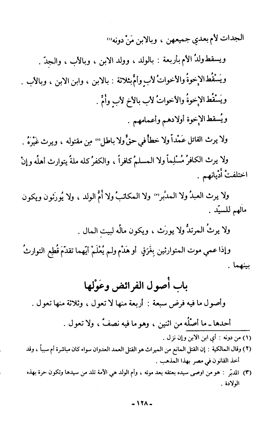 الْجدَّات لأم بعدِي جَمِيعهنَّ وبالابن من دونه وَيسْقط ولد الْأُم بأَرْبعَة بِالْوَلَدِ وَولد الابْن والن الابْن وبالأب وَيسْقط الْإِخْوَة وَالْأَخَوَات لأَب بالأخ لأَب وَأم وَيسْقط الْإِخْوَة أَوْلَادهم وأعمامهم وَلَا يَرث التاثل وَلَا خطأ فِي حق ملا بَاطِل من مقتوله وَيَرِث غَيره وَلَا يَرث الْكَافِر مُسلما وَلَا الْمُسلم كَافِرًا وَالْكفْر كُله مِلَّة يتوارث أَهله وَإِن اخْتلف أديانهم وَلَا يَرث العَبْد وَلَا الْمُدبر وَلَا الْمكَاتب وَلَا أم الْوَلَد وَلَا يَرِثُونَ وَيكون مَالهم للسَّيِّد وَلَا يَرث الْمُرْتَد وَلَا يُورث وَيكون مَاله لبيت المَال وَإِذا عمي موت المتوارثين بفرق أَو هدم وَلم يعلم أَيهمَا تقدم قطع التَّوَارُث بَينهمَا