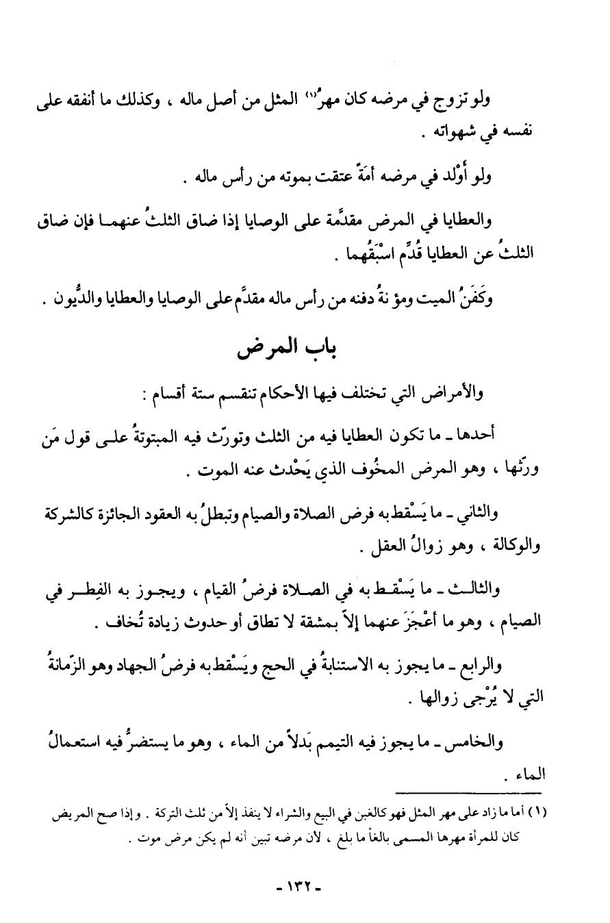 بَاب الْمَرَض والأمراض الَّتِي تخْتَلف فِيهَا الْأَحْكَام تَنْقَسِم سِتَّة أَقسَام أَحدهَا مَا تكون العطايا فِيهِ من الثُّلُث وتورث فِيهِ المبتوتة على قَول من ورثهَا وَهُوَ الْمَرَض الْمخوف الَّذِي يحدث عَنهُ الْمَوْت وَالثَّانِي مَا يسْقط بِهِ فرض الصَّلَاة وَالصِّيَام وَتبطل بِهِ الْعُقُود الْجَائِزَة كالشركة وَالْوكَالَة وَهُوَ زَوَال الْعقل وَالثَّالِث مَا يسْقط بِهِ فِي الصَّلَاة فرض الْقيام وَيجوز بِهِ الْفطر فِي الصّيام وَهُوَ مَا أعجز عَنْهُمَا إِلَّا مشقة لَا تطاق أَو حُدُوث زِيَادَة تخَاف وَالرَّابِع مَا يجوز بن الِاسْتِنَابَة فِي الْحَج وَيسْقط بِهِ فرض الْجِهَاد وَهُوَ الزمانة الَّتِي لَا يُرْجَى زَوَالهَا وَالْخَامِس مَا يجوز فِيهِ التَّيَمُّم بَدَلا من المَاء وَهُوَ مَا يستضر فِيهِ اسْتِعْمَال المَاء