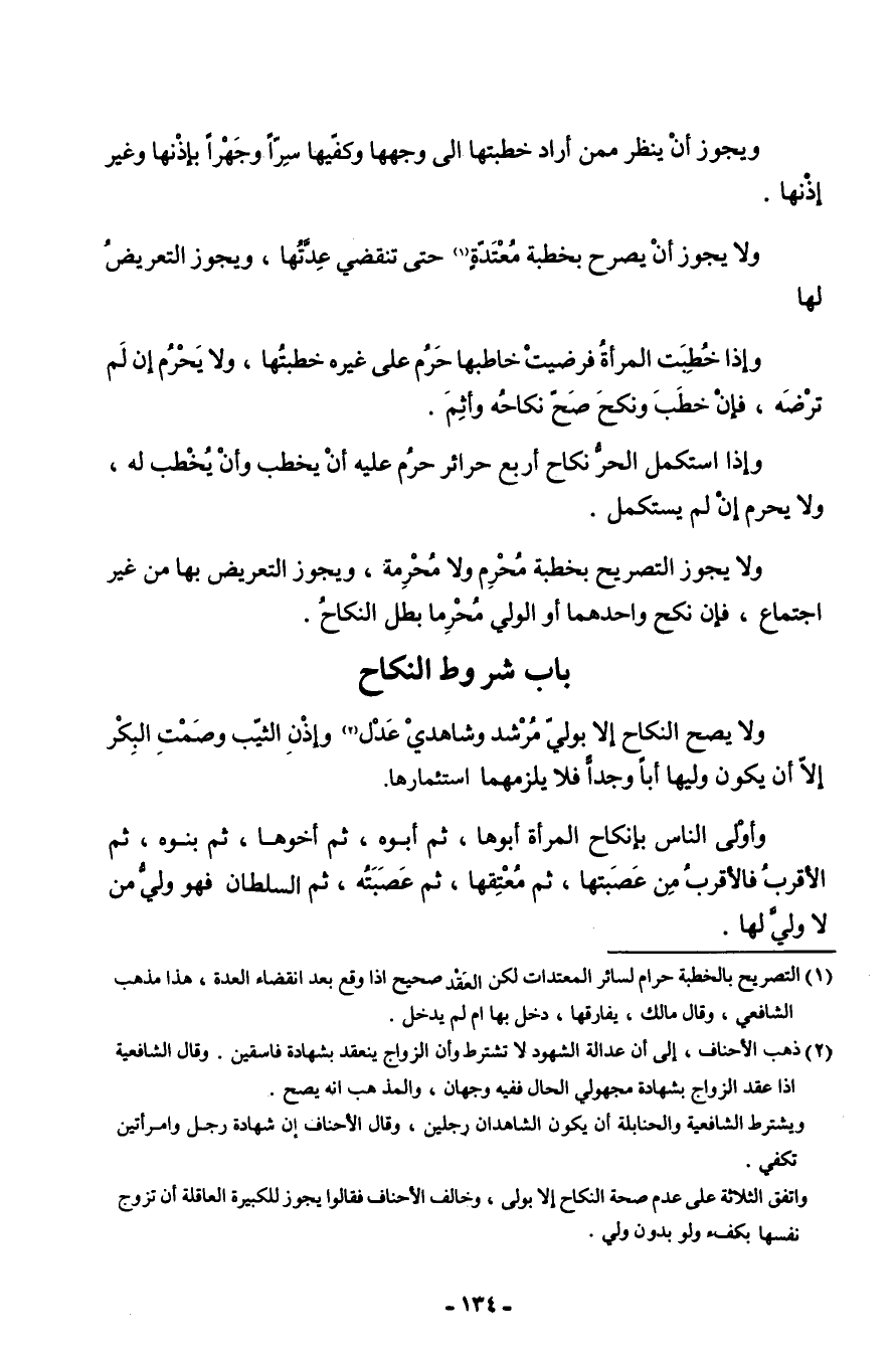 وَيجوز أَن ينظر مِمَّن أَرَادَ خطبتها إِلَى وَجههَا وكفيها سرا وجهرا بِإِذْنِهَا وَغير إِذْنهَا وَلَا يجوز أَن يُصَرح بِخطْبَة مُعْتَدَّة حَتَّى تَنْقَضِي عدتهَا وَيجوز التَّعْرِيض لَهَا وَإِذا خطبت الْمَرْأَة فرضيت خاطبها حرم على غَيره خطبتها وَلَا يحرم إِن لم ترضه فَإِن خطب صَحَّ نِكَاحه وأثم وَإِذا اسْتكْمل الْحر نِكَاح أَربع حرائر حرم عَلَيْهِ أَن يخْطب وَأَن يخْطب لَهُ وَلَا يحرم إِن لم يستكمل وَلَا يجوز التَّصْرِيح بِخطْبَة محرم وَلَا مُحرمَة وَيجوز التَّعْرِيض بهَا من غير اجْتِمَاع فَإِن نكح واحدهما أَو الْوَلِيّ محرما بَطل النِّكَاح