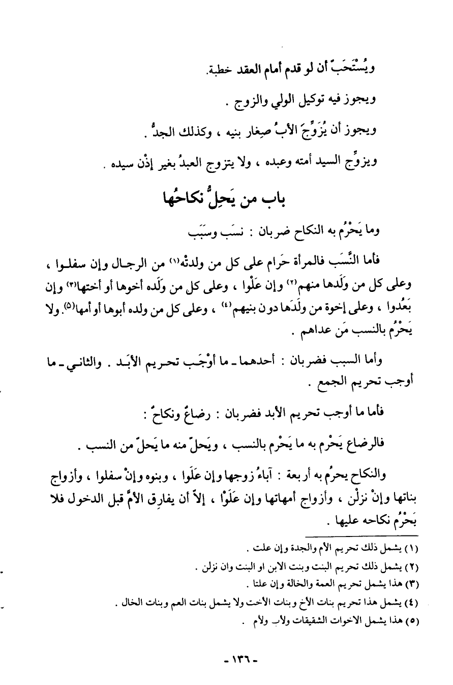 بَاب من يحل نِكَاحهَا وَمَا يحرم بِهِ النِّكَاح ضَرْبَان نسب وَسبب فَأَما لنسب فالمرأة على من وَلدته من الرِّجَال وَإِن سلفوا وعَلى كل من وَلَدهَا مِنْهُم وَإِن علوا وعَلى كل من وَلَده أَخُوهَا أَو أُخْتهَا وَإِن بعدوا وعَلى إخْوَة من وَلَدهَا دون بَينهم وعَلى كل من وَلَده أَبوهَا أَو أمهَا وَلَا يحرم بِالنّسَبِ من عداهم وَأما السَّبَب فضربان أَحدهمَا مَا أوجب تَحْرِيم الْأَبَد وَالثَّانِي مَا أوجب تَحْرِيم الْجمع فَأَما مَا أوجب تَحْرِيم الْأَبَد فضربان رضَاع وَنِكَاح فالرضاع يحرم بِهِ مَا يحرم بِالنّسَبِ وَيحل مِنْهُ مَا يحل من النّسَب وَالنِّكَاح يحرم بِهِ أَرْبَعَة آبَاء زَوجهَا وَإِن علوا وَبَنوهُ وَإِن سفلوا وَأَزْوَاج بناتها وَإِن نَزَلْنَ وَأَزْوَاج أمهاتها وَإِن علوا إِلَّا أَن يُفَارق الْأُم قبل الدُّخُول فَلَا يحرم نِكَاحه عَلَيْهَا