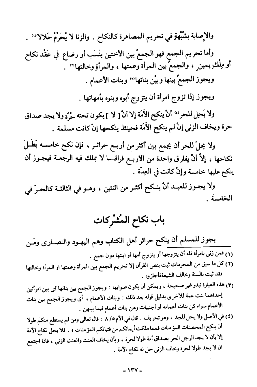 والإصابة بِشُبْهَة فِي تَحْرِيم الْمُصَاهَرَة كَالنِّكَاحِ وَالزِّنَا لَا يحرم حَلَالا وَأما تَحْرِيم الْجمع فَهُوَ الْجمع بَين الْأُخْتَيْنِ بِنسَب أَو رضَاع فِي عقد نكطاح أَو ملك يَمِين وَالْجمع بَين الْمَرْأَة وعمتها وَالْمَرْأَة وخالتها وَيجوز الحجمع بَينهَا وَبَين بناتها وَبَنَات عماتها ويدجوز إِذا تزوج امْرَأَة أَن ينزوج أَبوهُ وَبَنوهُ بأمهاتها وَلَا يحل للْحرّ أم ينْكح الْأمة إِلَّا أَن (لَا) يكون تَحْتَهُ حرَّة وَلَا يجد صدَاق حرَّة وَيخَاف الزِّنَى إِن لم ينْكح الْأمة فَحِينَئِذٍ ينْكِحهَا إِن كَانَت مسلمة وَلَا يحل للْحرّ أَن يجمع بَين اكثر من أَربع حرائر فَإِن نكح خَامِسَة بَطل نِكَاحهَا إِلَّا أَن يُفَارق وَاحِدَة من الْأَرْبَع فراقا لَا يملك فِيهِ الرّجْعَة فَيجوز أَن ينْكح عَلَيْهَا خامسشة وَإِن كَانَت فِي الْعدة وَلَا يجوز للْعَبد أَن ينْكح أَكثر من اثْنَتَيْنِ وَهُوَ فِي الثَّالِثَة كَالْحرِّ فِي الْخَامِسَة