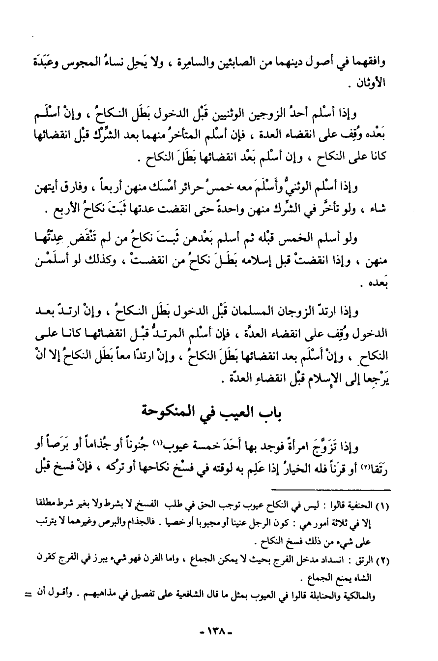 بَاب الْعَيْب فِي المنكوحه وَإِذا تزوج امْرَأَة فَوجدَ بهَا أحد خَمْسَة عُيُوب جنونا أَو جذاما أَو برصا أَو رتقا أَو قرنا فَلهُ الْخِيَار إِذا علم بِهِ لوقته فِي فسخ نِكَاحهَا أَو تَركه فَإِن فسخ قبل