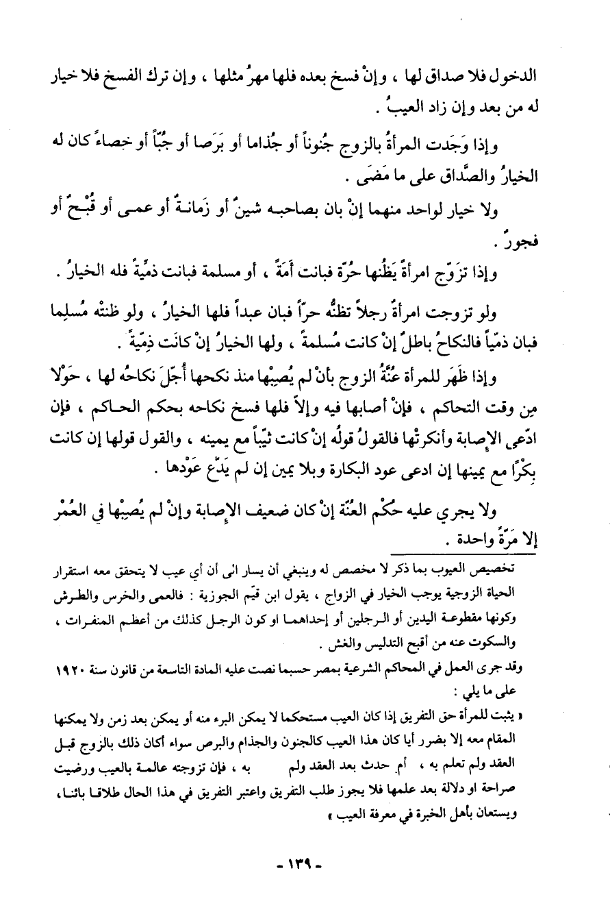 الدُّخُول فَلَا صدَاق لَهَا وَإِن فسخ بعده فلهَا مهر مثلهَا وَإِن ترك الْفَسْخ فَلَا خِيَار لَهُ من بعد وَإِن زَاد الْعَيْب وَإِذا وجدت الْمَرْأَة بِالزَّوْجِ جنونا أَو جذاما أَو برصا أَو جبا أَو خصاء كَانَ لَهُ الْخِيَار وَالصَّدَاق على مَا مضى وَلَو تزوجت امْرَأَة رجلا تظن حرا فَبَان عبدا فلهَا الْخِيَار وَلَو ظنته مُسلما فَبَان ذِمِّيا فَالنِّكَاح بَاطِل إِن كَانَت مسلمة وَلها الْخِيَار إِن كَانَت ذِمِّيَّة وَإِذا ظهر للْمَرْأَة عنة الزَّوْج بِأَن لم يصبهَا مُنْذُ نَكَحَهَا أجل نِكَاحه لَهَا حولا من وَقت التحاكم فَإِن أَصَابَهَا فِيهِ وَإِلَّا فلهَا فسخ نِكَاحه بِحكم الْحَاكِم فَإِن اعى الْإِصَابَة وأنكرتها فَالْقَوْل قَوْله إِن كَانَت ثَيِّبًا مَعَ يَمِينه وَالْقَوْل قَوْلهَا إِن كَانَت بكرا مَعَ يَمِينهَا إِن ادّعى عود الْبكارَة وَبلا يَمِين إِن لم يدع عودهَا وَلَا يجْرِي عَلَيْهِ حكم الْعنَّة إِن كَانَ ضَعِيف الْإِصَابَة وَإِن لم يصبهَا فِي الْعُمر إِلَّا مرّة وَاحِدَة