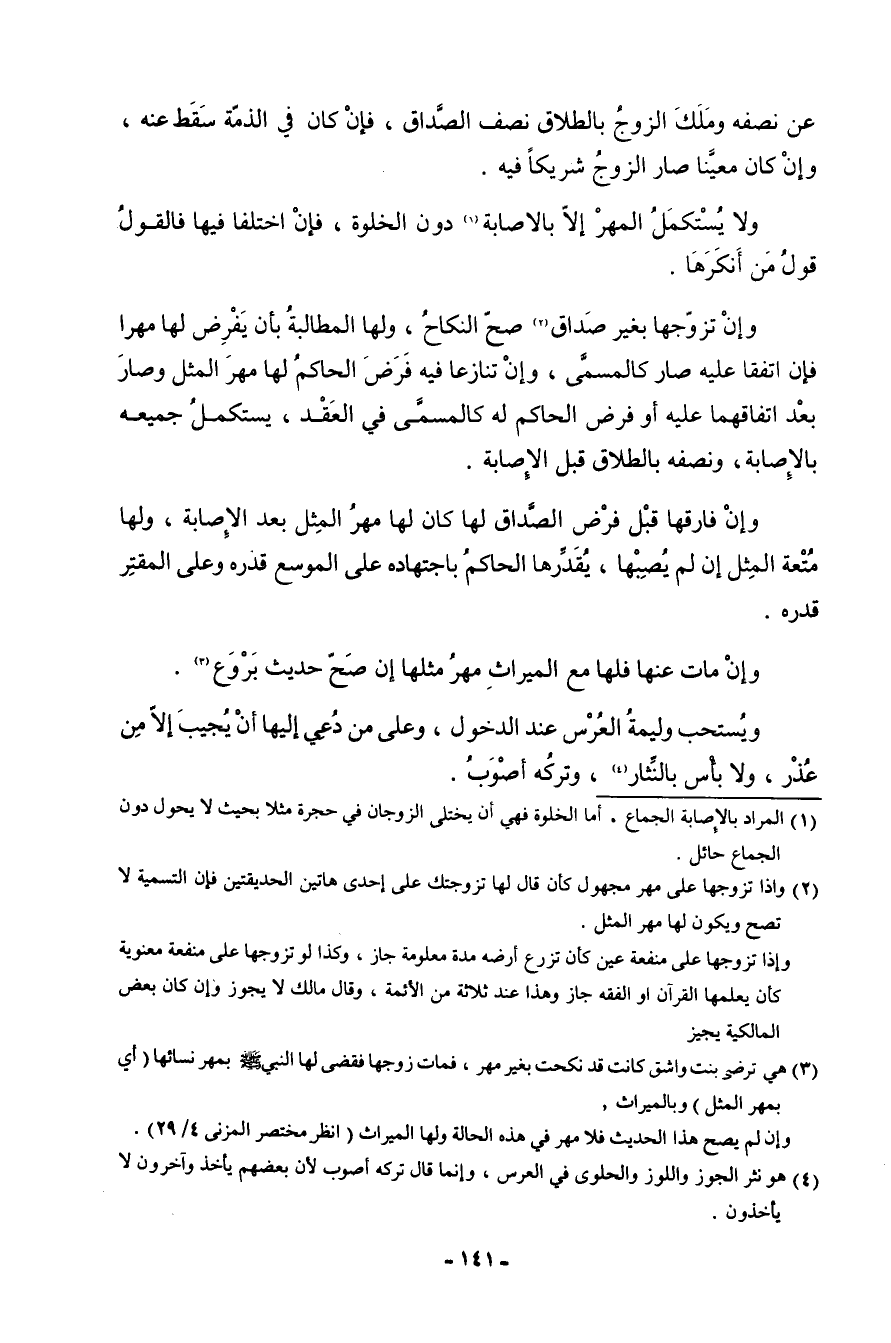 عَن نصفه وَملك الزَّوْج بِالطَّلَاق نصف الصَدَاق فَإِن كَانَ فِي الذِّمَّة سقط عَنهُ وَإِن كَانَ معينا صَار الزَّوْج شَرِيكا فِيهِ وَلَا يستكمل الْمهْر إِلَّا بالاصابة دون لخلوة فَإِن اخْتلفَا فِيهَا فلاقول قَول من أنكرها وَإِن تزَوجهَا بِغَيْر صدَاق صَحَّ النِّكَاح وَلها الْمُطَالبَة بِأَن يفْرض لَهَا مهْرا فَإِن اتفقَا عَلَيْهِ صَار كالمسمى وَإِن تنَازعا فِيهِ فرض الْحَاكِم لَهَا هر الْمثل وَصَارَ بعد اتِّفَاقهمَا عَلَيْهِ أَو فرض الْحَاكِم لَهُ كالمسمى فِي العقد يستكمل جَمِيعه بالإصابة نصفه بِالطَّلَاق قبل الْإِصَابَة وَإِن فَارقهَا قبل فرض الصَدَاق لَهَا كَانَ لَهَا مهر الْمثل بعد الاصابة وَلها مُتْعَة الْمثل إِن لم يصبهَا يقدرها الْحَاكِم بِاجْتِهَادِهِ على الموسع قدره وعَلى لمقتر قدره وَإِن مَاتَ عَنْهَا فلهَا مَعَ الْمِيرَاث مهر مثلهَا إِن صَحَّ حَدِيث بروع وَيسْتَحب وَلِيمَة الْعرس عِنْد الدُّخُول وعَلى من دعِي إِلَيْهَا أَن يُجيب إِلَّا من عذر وَلَا بَأْس بالنثار وَتَركه أصوب