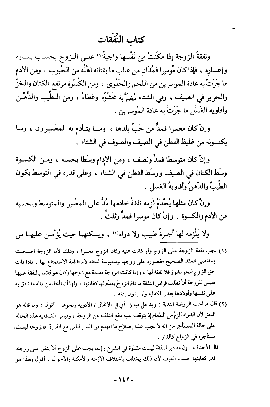 كتاب النَّفَقَات وَنَفَقَة الزَّوْجَة إِذا مكنت من نَفسهَا وَاجِبَة على الزَّوْج بِحَسب يسَاره وإعساره فَإِذا كَانَ مُوسِرًا فمدان من غَالب مَا يقتاته أَهله من الْحُبُوب وَمن الْأدم مَا جرت بِهِ عَادَة المسرين من اللَّحْم والحلوى وَمن الْكسْوَة مُرْتَفع الْكَتَّان والخز وَالْحَرِير فِي الصَّيف وَفِي الشتَاء مضربة محشوة وغطاء وَمن الطّيب والدهن وأفاويه الْغسْل مَا جرت بِهِ عَادَة الموسرين وَإِن كَانَ مُعسرا فَمد من حب بَلَدهَا وَمَا يتأدم بِهِ المعسرون وَمَا يكتسونه من غليظ الْقطن فِي الصَّيف وَالصُّوف فِي الشتَاء وَإِن كَانَ متوسطا فَمد وَنصف وَمن الإدام وسطا بِحَسبِهِ وَمن الْكسْوَة وسط الْكَتَّان فِي الصَّيف ووسط الْقطن فِي الشتَاء وعَلى قدره فِي التَّوَسُّط يكون الطّيب والدهن وأفاويه الْغسْل وَإِن كَانَ مثلهَا يخْدم لزمَه نَفَقَة خَادِمهَا مد على الْمُعسر والمتوسط وبحسبه من الْأدم وَالْكِسْوَة وَإِن كَانَ مُوسِرًا فَمد وَثلث وَلَا يلْزمه لَهَا أُجْرَة طبي وَلَا دَوَاء ويسكنها حَيْثُ يُؤمن عَلَيْهَا من