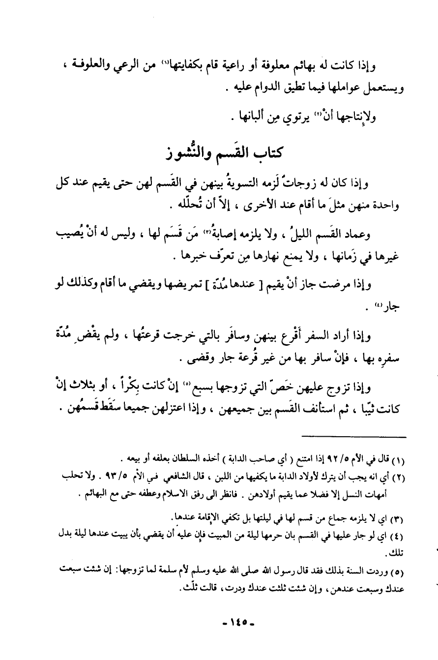 كتاب الْقسم والنشوز وَإِذا كَانَت لَهُ زَوْجَات لزمَه التَّسْوِيَة بَينهُنَّ فِي الْقسم حَتَّى يُقيم عِنْد كل وَاحِدَة مِنْهُنَّ مثل مَا أَقَامَ عِنْد الْأُخْرَى إِلَّا أَن تحلله وعماد الْقسم اللَّيْل وَلَا يلْزمه إِصَابَة من قسم لَهَا وَلَيْسَ لَهُ أَن يُصِيب غَيرهَا فِي زمانها وَلَا يمْنَع نَهَارهَا من تعرف خَبَرهَا وَإِذا مَرضت جَازَ لَهَا أَن يُقيم (عِنْدهَا مُدَّة) تمريضها وَيَقْضِي مَا أَقَامَ وَكَذَلِكَ لَو جَار وَإِذا أَرَادَ السّفر أَقرع بَينهُنَّ وسافر بِالَّتِي خرجت قرعتها وَلم يقْض مُدَّة سَفَره بهَا فَإِن سَافر بهَا من غير قرعَة جَار وَقضى وَإِذا تزوج عَلَيْهِنَّ خص الَّتِي تزَوجهَا بِسبع إِن كَانَت بكرا أَو بِثَلَاث إِن كَانَت ثَيِّبًا ثمَّ اسْتَأْنف بَين جميعيهن وَإِذا اعتزلهن جَمِيعًا سقط قسمهن