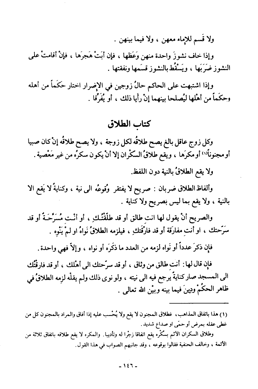 كتاب الطَّلَاق وكل زوج عَاقل بَالغ يَصح طَلَاقه لكل زَوْجَة وَلَا يَصح طَلَاقه إِن كَانَ صَبيا أَو مَجْنُونا أَو مكْرها وَيَقَع طَلَاق السَّكْرَان إِلَّا أَن يكون سكره من غير مَعْصِيّة وَيَقَع الطَّلَاق بِالنِّيَّةِ دون اللَّفْظ وألفاظ الطَّلَاق ضَرْبَان صَرِيح لَا يفْتَقر وُقُوعه إِلَى نِيَّة وكناية لَا يَقع إِلَّا بِالنِّيَّةِ وَلَا يَقع بِمَا لَيْسَ بِصَرِيح وَلَا كِنَايَة والصريح أَن يَقُول لَهَا أنتن طَالِق أَو قد طَلقتك أَو أَنْت مسرحة أَو قد سرحتك أَو أَنْت مُفَارقَة أَو قد فارقتك فَيلْزمهُ الطَّلَاق نَوَاه أَو لم يُنَوّه فَإِن ذكر عددا أَو نَوَاه لزمَه من الْعدَد مَا ذكره أَو نَوَاه وَإِلَّا فَهِيَ وَاحِدَة فَإِن قَالَ لَهَا أَنْت طَالِق من وثاق أَو قد سرحتك إِلَى أهلك أَو قد فارقتك إِلَى الْمَسْجِد صَار كِنَايَة يرجع فِيهِ إِلَى نِيَّته وَلَو نوى ذَلِك وَلم يقلهُ لزمَه الطَّلَاق فِي ظَاهر الحكم وَدين فِيمَا بَينه وَبَين الله تَعَالَى