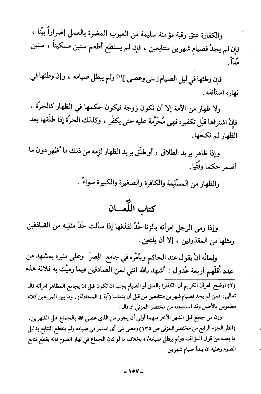 وَالْكَفَّارَة عتق رَقَبَة مُؤمنَة سليمَة من الْعُيُوب الْمضرَّة بِالْعَمَلِ إِضْرَارًا بَينا فَإِن لم يجد فصيان شخرين مُتَتَابعين فَإِن لم يسْتَطع أطْعم سِتِّينَ مِسْكينا سِتِّينَ مدا