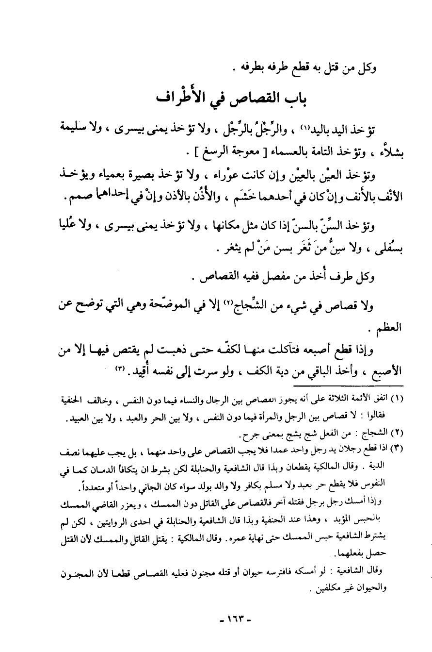 تُؤْخَذ الْيَد بِالْيَدِ وَالرجل بِالرجلِ وَلَا تُؤْخَذ يمنى بيسرى وَلَا سليمَة بشلاء وَتُؤْخَذ التَّامَّة بالعسماء معوجة الرسغ