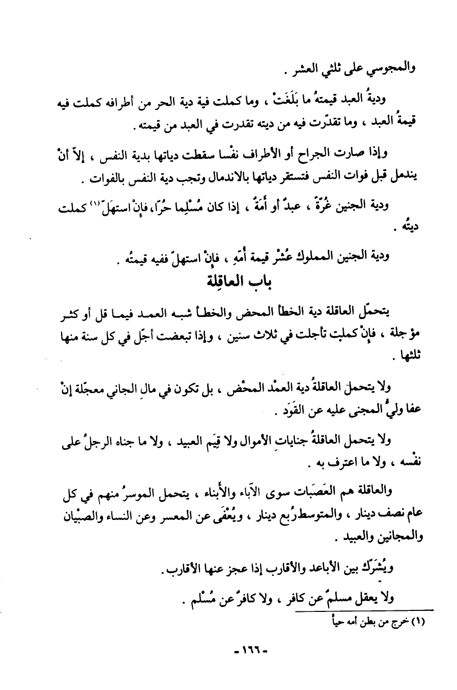 والعاقلة هم الْعَصَبَات سوى الأباء وَالْأَبْنَاء يتَحَمَّل الْمُوسر مِنْهُم فِي كل عَام نصف دِينَار والمتوسط ربع دينا ويعفى عَن الْمُعسر وَعَن النِّسَاء وَالصبيان والمجانين وَالْعَبِيد