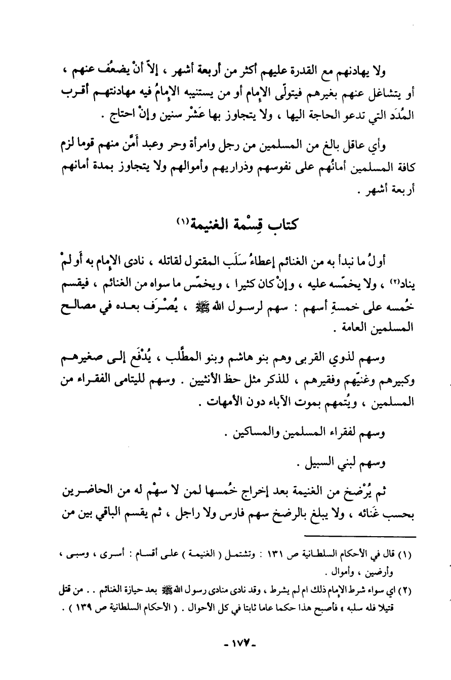 أول مَا نبدأ بِهِ من الْغَنَائِم إِعْطَاء سلب الْمَقْتُول لقاتله نَادَى الإِمَام بِهِ أَو لم يناد وَلَا يخمسه عَلَيْهِ وَإِن كَانَ كثيرا ويخمس مَا سواهُ من الْغَنَائِم فَيقسم خمسه على خَمْسَة أسْهم سهم لرَسُول الله صلى الله عَلَيْهِ وَسلم يصرف بعده فِي مصَالح الْمُسلمين الْعَامَّة