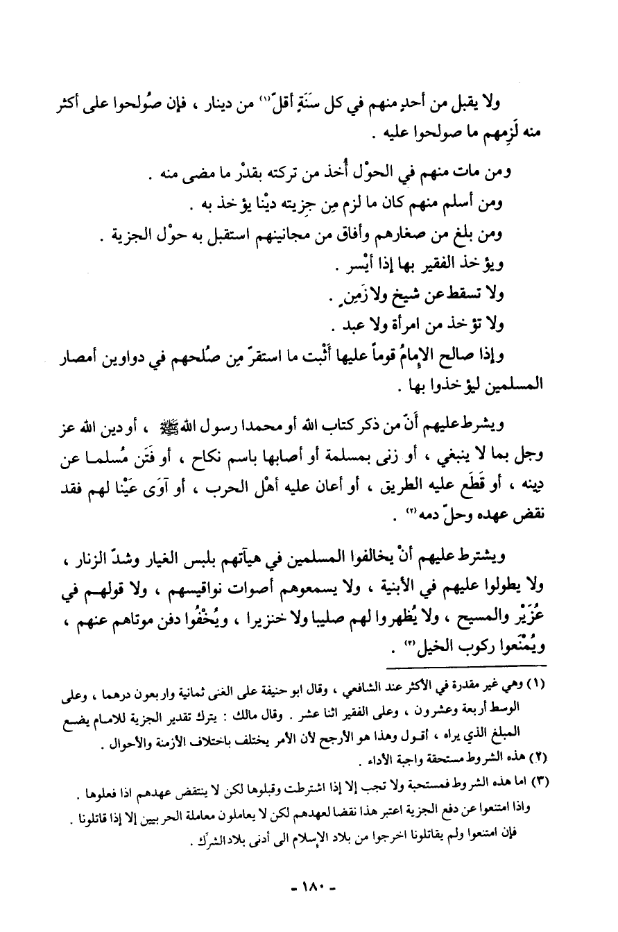 وَيشْتَرط عَلَيْهِ أَن من ذكر كتاب الله أَو مُحَمَّدًا رَسُول الله صلى الله عَلَيْهِ وَسلم أَو دين الله عز وَجل بِمَا لَا يَنْبَغِي أَو زنى بِمسلمَة أَو أَصَابَهَا باسم نِكَاح أَو فتن مُسلما عَن دينه أَو قطع عَلَيْهِ الطَّرِيق أَو أعَان عَلَيْهِ أهل الْحَرْب أَو آوى عينا لَهُم فقد نقض عَهده وَحل دَمه