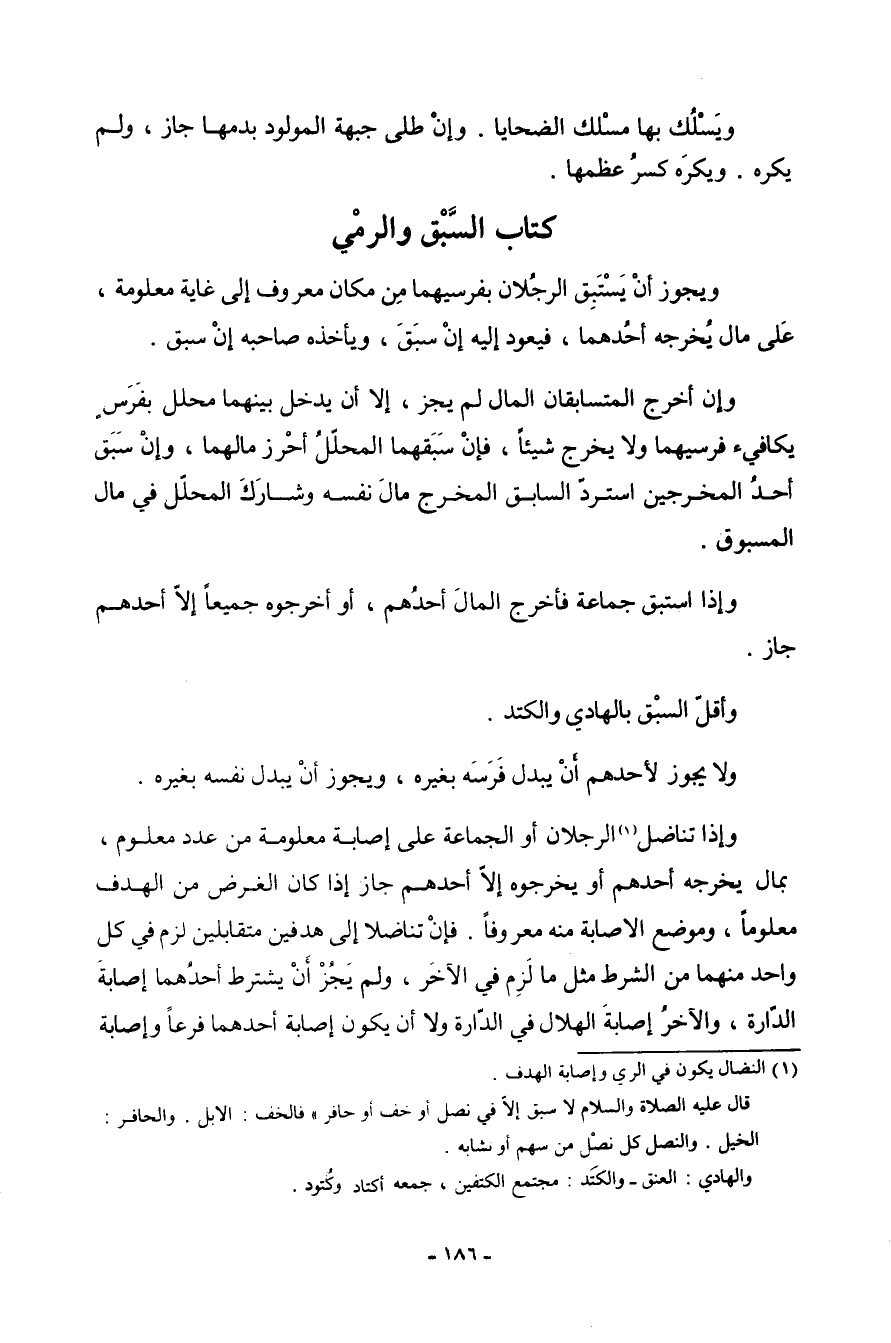 ويسلك بهَا مَسْلَك الضَّحَايَا وَإِن طلى جبهة الْمَوْلُود بدمها جَازَ وَلم يكره وَيكرهُ كسر عظمها = كتاب السَّبق وَالرَّمْي
