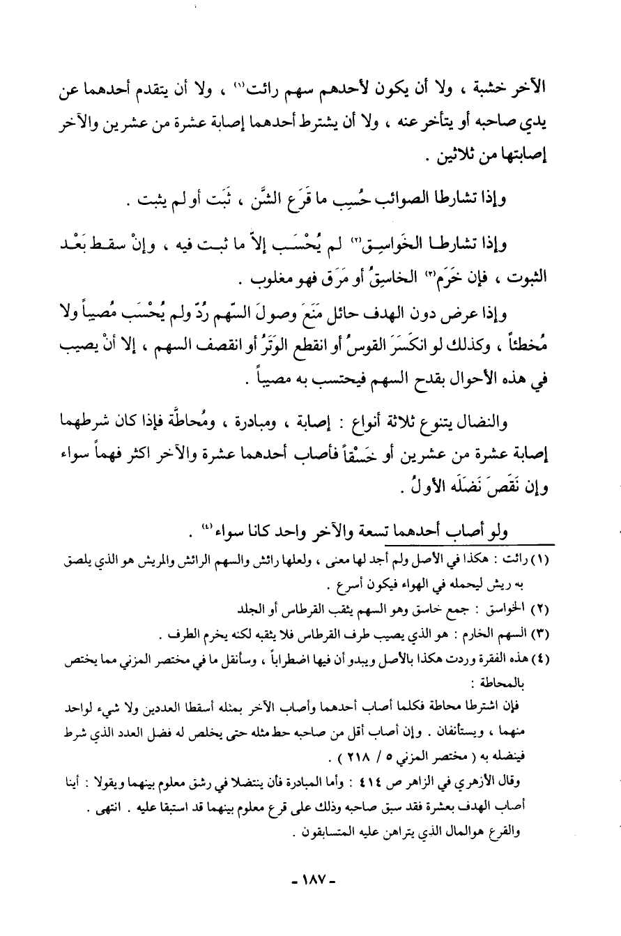 والنضال يتنوع ثَلَاثَة أَنْوَاع إِصَابَة ومبادرة ومحاطة فَإِذا كَانَ شَرطهمَا إِصَابَة عشرَة من عشْرين أَو خسقا فَأصَاب أَحدهمَا عشرَة والآخرأكثر فهما سَوَاء وَإِن نقص نضله الأول