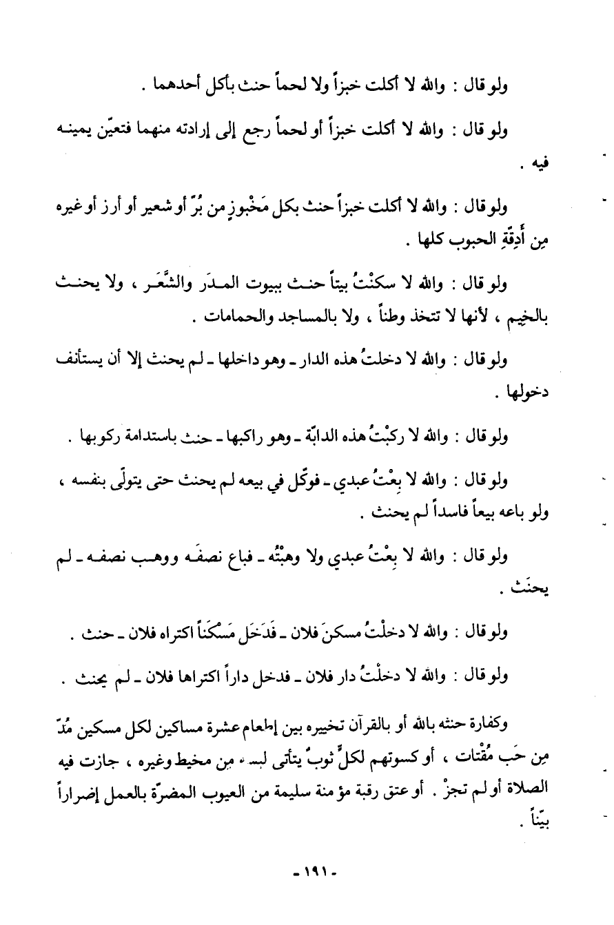 وَكَفَّارَة حنثه بِاللَّه أَو بِالْقُرْآنِ تخييره بَين إطْعَام عشرَة مَسَاكِين لكل مِسْكين مد من حب مقتات أَو كسوتهم لكل ثوب يَتَأَتَّى لبسه من مخيط وَغَيره جَازَت فِيهِ الصَّلَاة أَو لم تجز أَو عتق رَقَبَة مُؤمنَة سليمَة من الْعُيُوب الْمضرَّة بِالْعَمَلِ إِضْرَارًا بَينا