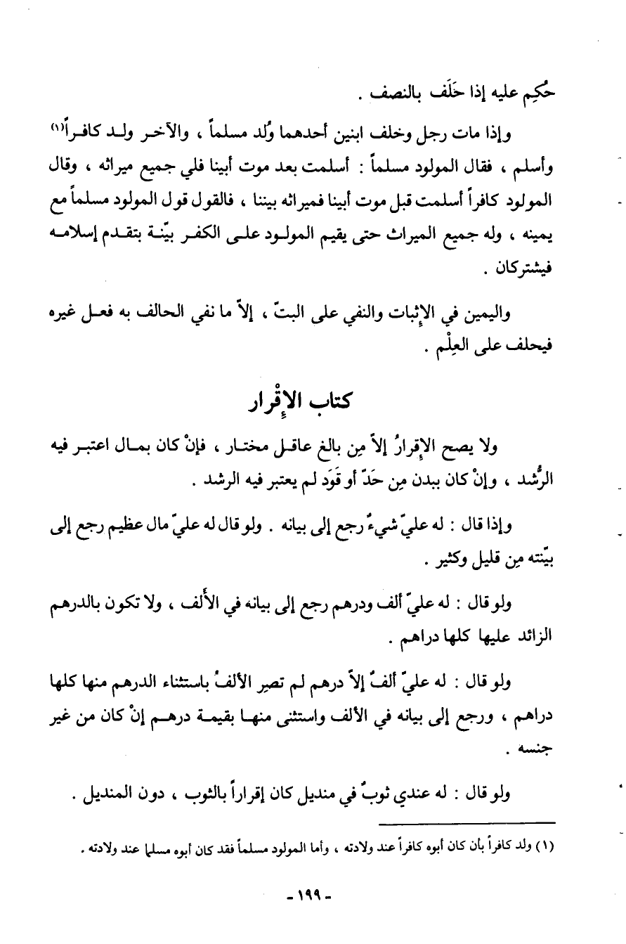 وَإِذا مَاتَ رجل وَخلف ابْنَيْنِ أَحدهمَا ولد مُسلما وَالْآخر ولد كَافِرًا وَأسلم فَقَالَ الْمَوْلُود مُسلما أسلمت بعد موت أَبينَا فلي جَمِيع مِيرَاثه وَقَالَ الْمَوْلُود كَافِرًا أسلمت قبل موت أَبينَا فميراثه بَيْننَا فَالْقَوْل قَول الْمَوْلُود مُسلما مَعَ يَمِينه وَله جَمِيع الْمِيرَاث حَتَّى يُقيم الْمَوْلُود على الْكفْر بَيِّنَة بتقدم إِسْلَامه فيشتركان