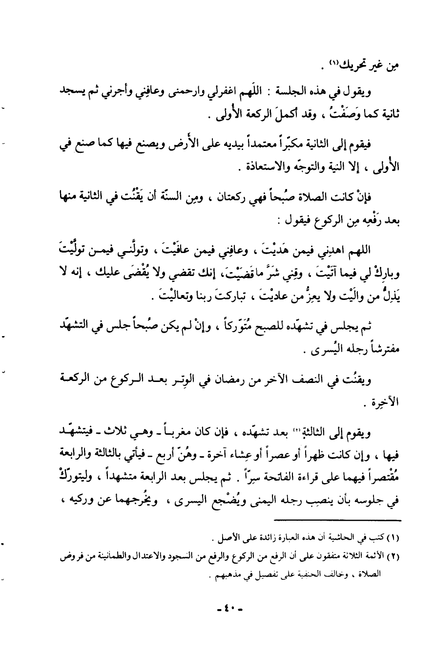 من غير تَحْرِيك وَيَقُول فِي هَذِه الجلسة اللَّهُمَّ أَغفر لي وارحمن وأجرني ثمَّ يسْجد ثَانِيَة كَمَا وصفت وَقد أكمل الرَّكْعَة الأولى فَيقوم إِلَى الثَّانِيَة مكبرا مُعْتَمدًا بيدَيْهِ على الأَرْض ويصنع خفيها كَمَا صنع فِي الأولى إِلَّا النِّيَّة والتوجه والاستعاذة فَإِن كَانَت الصَّلَاة ضصبحا فَهِيَ رَكْعَتَانِ وَمن السّنة أَن يقنت فِي الثَّانِيَة مِنْهَا بعد رَفعه من الرُّكُوع فَيَقُول اللَّهُمَّ اهدني فِيمَن هديت وَعَافنِي فِيمَن عافيت وتولني فِيمَن توليت وَبَارك لي فِيمَا آتيت وقني شَرّ مَا قضيت إِنَّك تقضي وَلَا يقْضى عَلَيْك إِنَّه لَا يذل من واليت وَلَا يعز من عاديت تَبَارَكت رَبنَا وَتَعَالَيْت ثمَّ يجلس فِي تشهده للصبح متوركا وَإِن لم يكن صبحا جلس فِي التَّشَهُّد مفترشا رجله الْيُسْرَى ويقنت فِي النّصْف الآخر من رَمَضَان فِي الْوتر بعد الرُّكُوع من الرَّكْعَة الْآخِرَة وَيقوم إِلَى الثَّالِثَة بعد تشهده فَإِن كَانَ مغربا وَهِي ثَلَاث فيتشهد فِيهَا وَإِن كَانَت ظهرا أَو عصرا أَو عشَاء آخِرَة وَهن أَربع فَيَأْتِي بالثالثة وَالرَّابِعَة مُقْتَصرا فيهمَا على قِرَاءَة الْفَاتِحَة سرا ثمَّ يجلس بعد الرَّابِعَة متشهدا ولتورك فِي جُلُوسه بِأَن ينصب رجله الْيُمْنَى ويضجع الْيُسْرَى ويخرجهما عَن وركيه